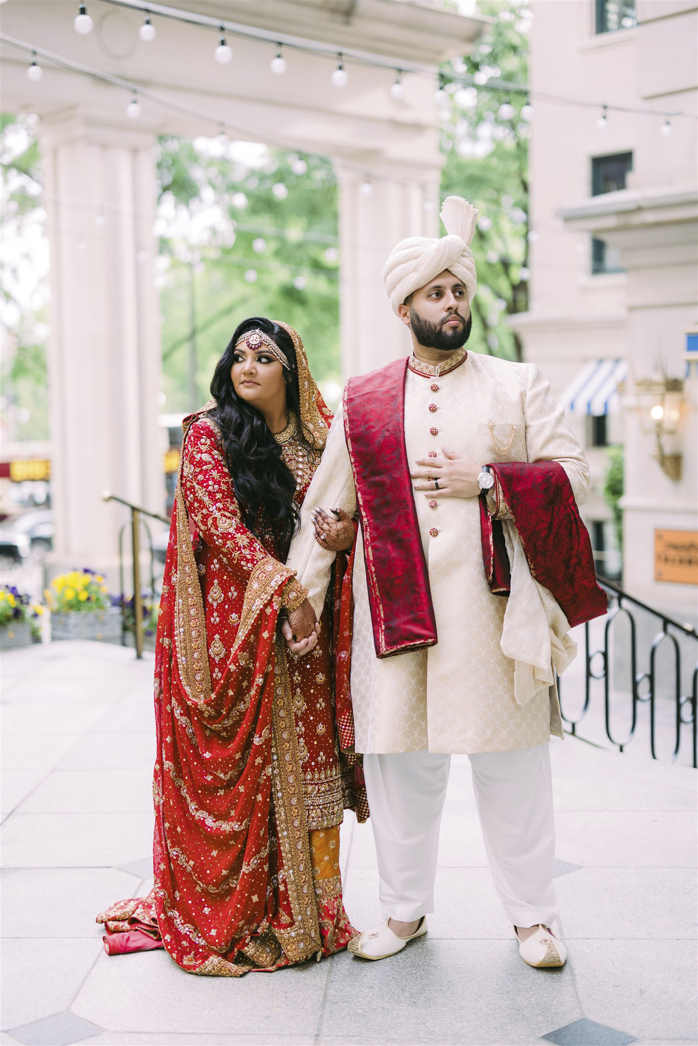 The double wedding celebrations were also family-and-friends affairs. First: an intimate “garden oasis” ceremony with 20 guests at Sheeza’s parents’ home in Old Town. Four months later: a grand 200-person fete at the Willard hotel that Umer says still felt warm and personal. For the DC reception—decorated in white, blush, pink, and burgundy—the couple prioritized transforming the space to distinguish it from other events that had come before it. “The drapery definitely did the trick!” Sheeza says, as did installations of roses and greenery. Guests found their table numbers at a dramatic tree-inspired escort wall, and the couple made their first dance extra-sentimental by selecting Sheeza’s grandparents’ favorite song. After dinner—a duet of crabcake and short rib—the newlyweds cut a marble-and-white-chocolate cake decorated in a cascade of more than 600 red roses.