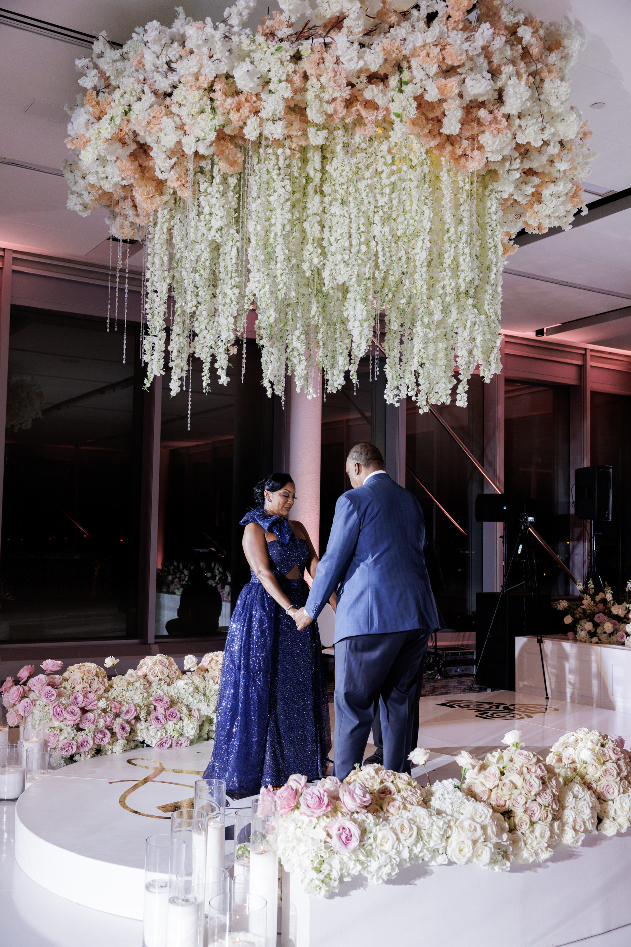 In addition to the floral chandelier and floral-lined bandstand, which served as focal points, elements of decor included mirrored tables and a Champagne wall with a sign that read “Cheers to the Goode Life.” Blush and navy with gold accents decorated the room, which also included a sweeping view of the DC skyline through wall-to-wall windows. See the details from the big day below.