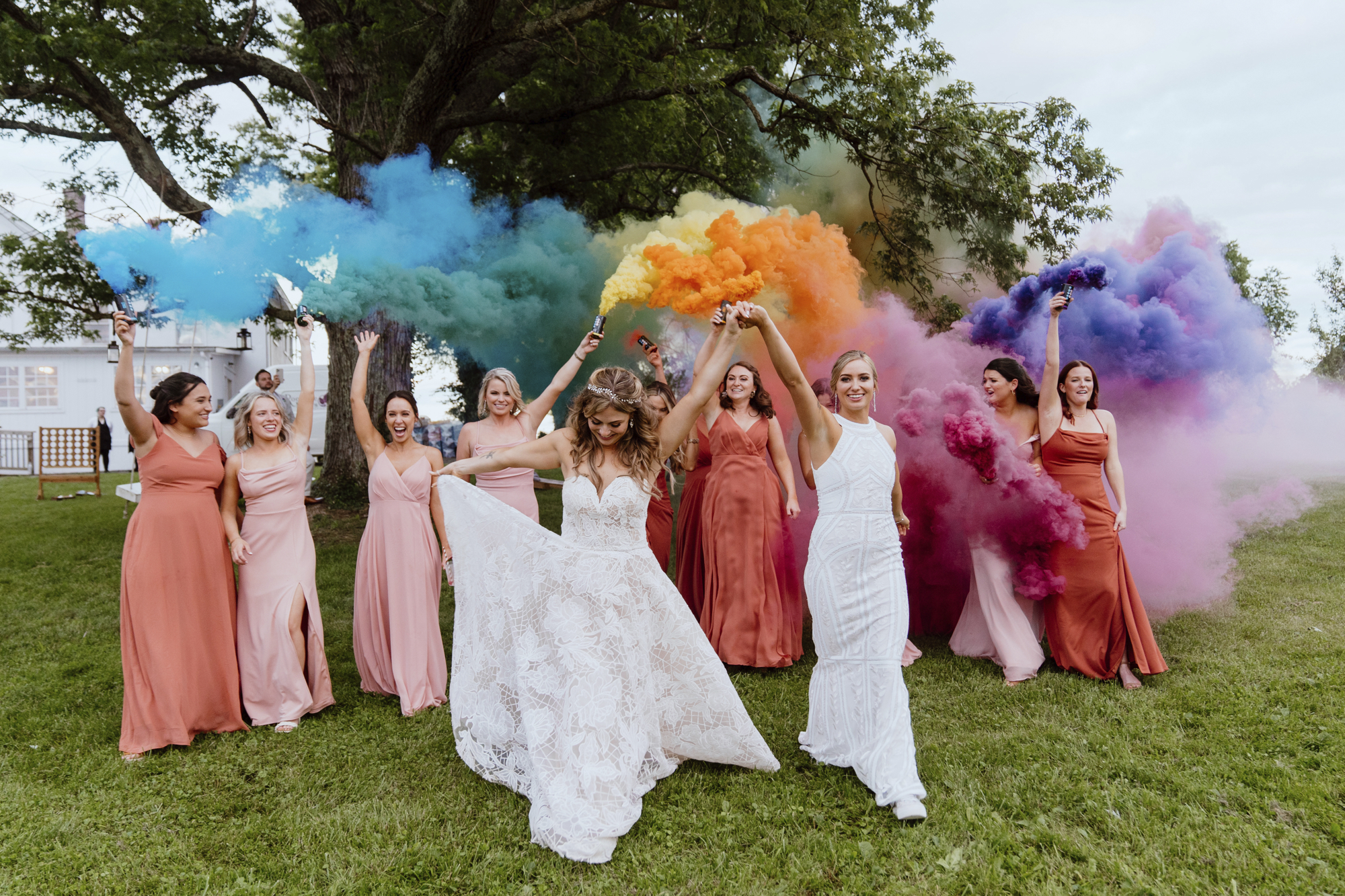 Jamie’s favorite memories of the weekend are the roast of the couple emceed by two bridesmaids at the rehearsal dinner and the moment when Sunnie, the “flower dog,” joined the newlyweds in their first dance, unprompted. Self-serve rosé on tap before the ceremony was a hit, and a flip-cup challenge between the bridal parties during their reception entrance set a fun tone. A private cake-cutting with the bridesmaids and family took place before the ceremony. Sunset brought a rainbow-smoke-bomb photo session.