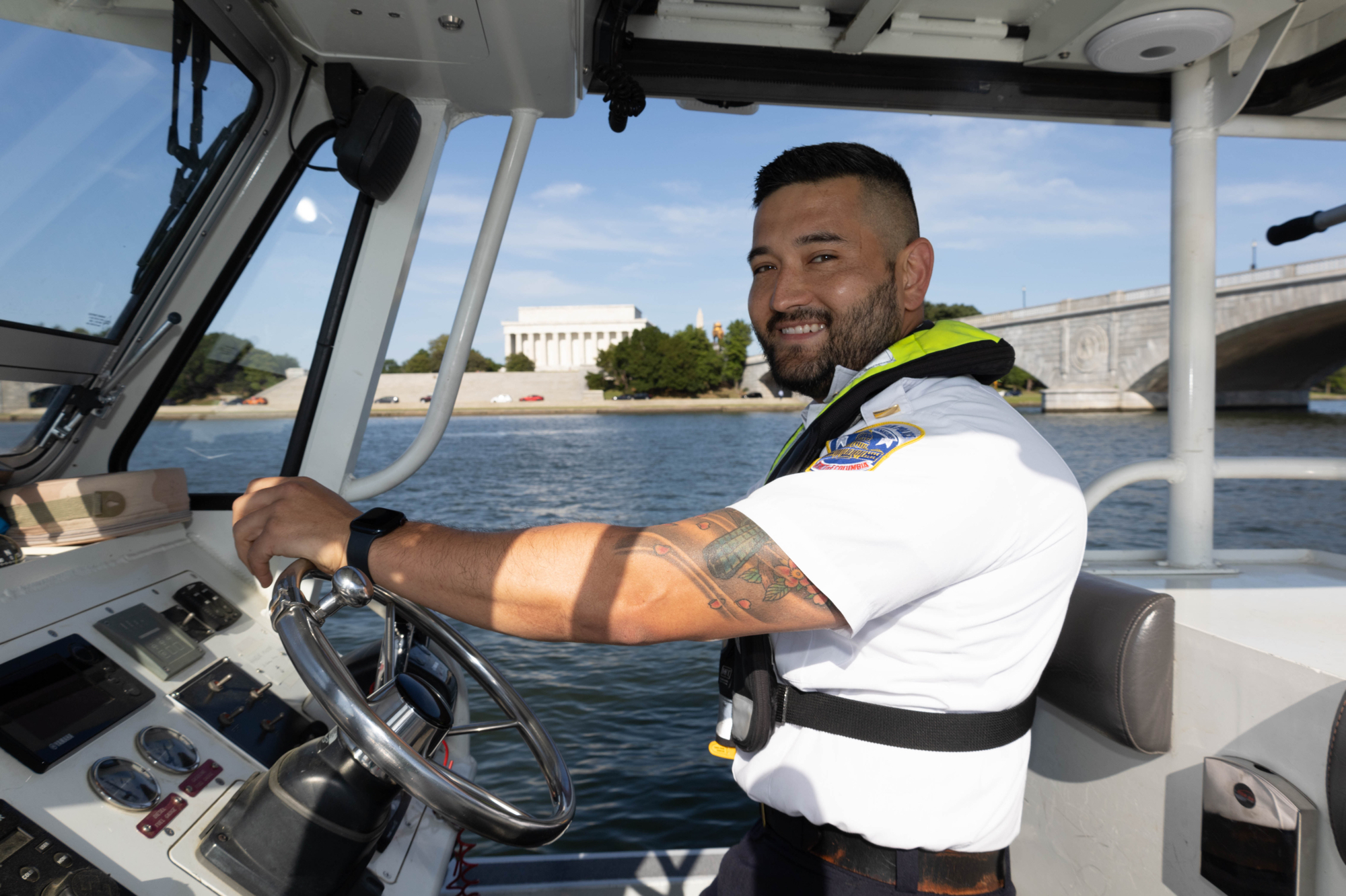 “On the Fourth of July, this whole area will be completely filled with boats,” Horos shouts over the motor, gesturing toward the waters by the Lincoln Memorial. “We’ll anchor our command boat right in the middle of all the chaos. It’s set up with food and water for the officers, so it’s kind of like a base for them to come back to.” Then, throughout the day, six to eight MPD boats patrol the area, staying visible to prevent rowdiness, and proximate in case the merriment takes a bad turn. The Coast Guard and fire department maintain a presence, too.