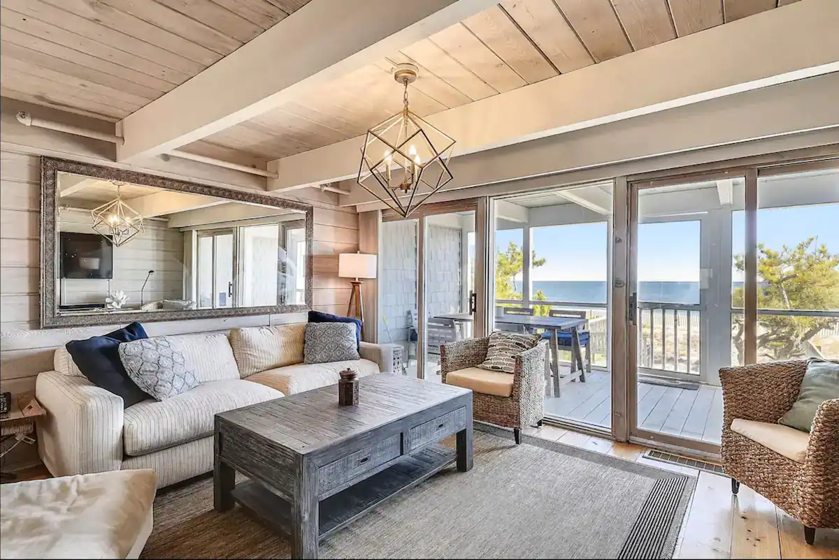 This pet-friendly Airbnb in Rehoboth Beach offers four bedrooms and two bathrooms and is located one block off Rehoboth Avenue, two blocks to Dogfish Head, and a 15-minute walk to the boardwalk. It’s got a fenced-in yard, parking for three cars, a screened-in porch, an outdoor shower, and a fire pit for relaxing outside at home.