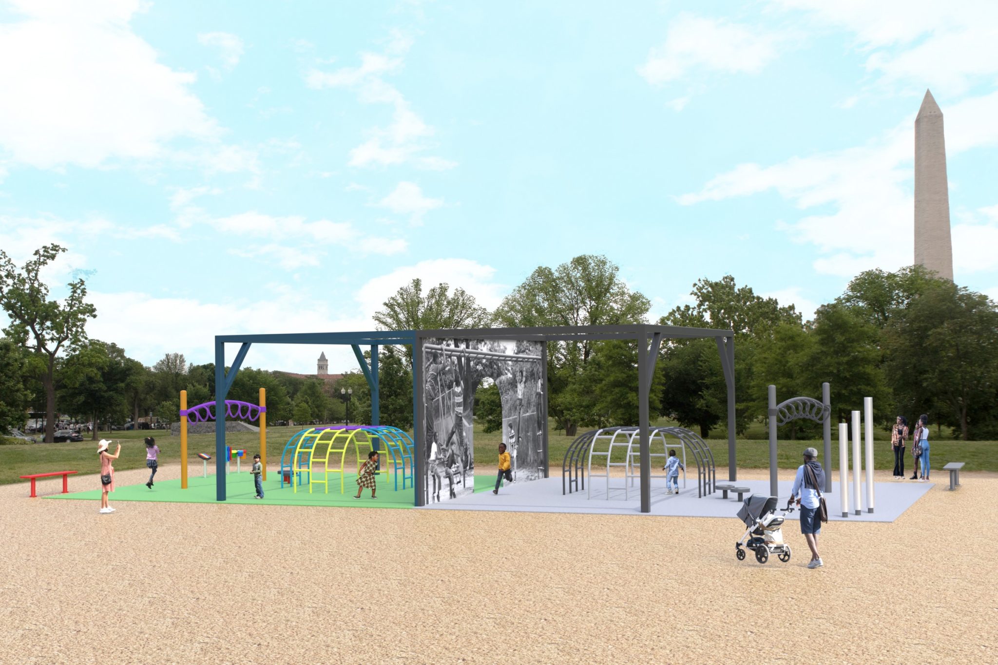 Not long after DC’s parks became desegregated, a photographer captured an image of Black and white children playing together at the city’s previously all-white Edgewood Park. Inspired by this archival photo, Brooklyn-based artist Derrick Adams will commemorate desegregation by erecting an interactive jungle gym titled “America’s Playground” that’s colorful on one side and monochromatic on the other.