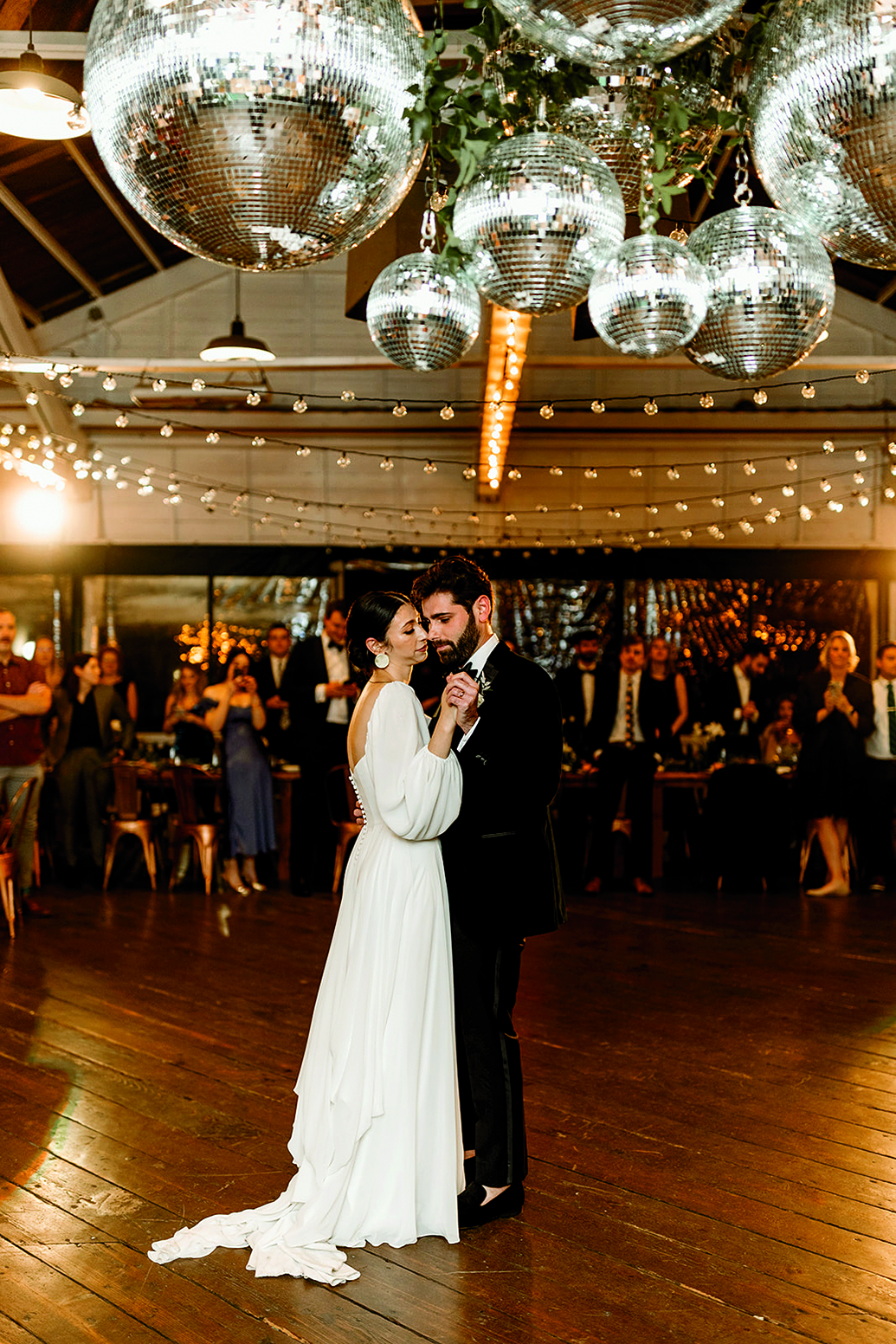 On their first date, at Jack Rose Dining Saloon in Adams Morgan, Amanda and Jason closed down the bar. Four and a half years later, Jason proposed in a cabin in Michigan over Fourth of July weekend. Their modern-disco-themed celebration gestured to the season and Glen Echo Park’s retro vibe with disco balls, velvet, and autumnal olive-green, mustard, and terra-cotta hues with black and gold accents.