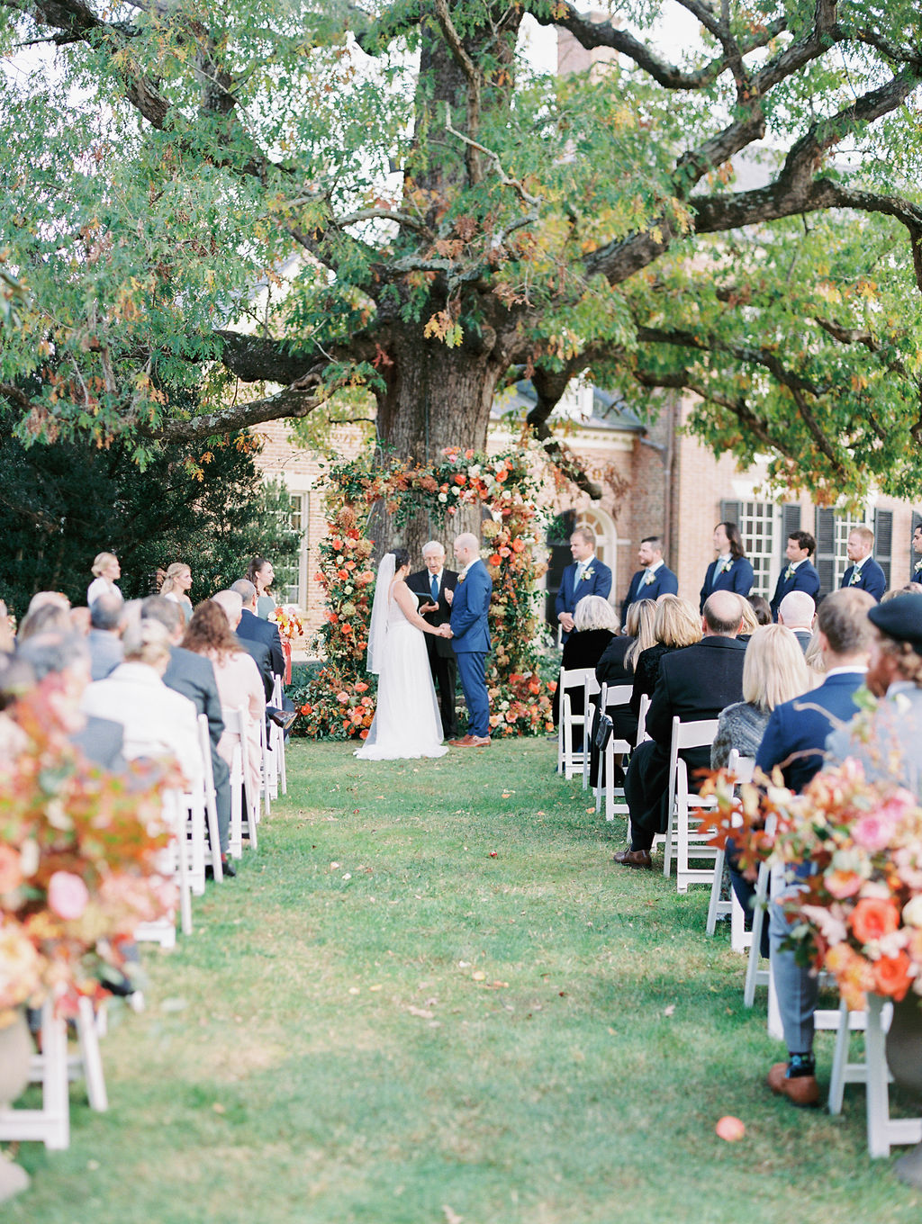 The November wedding at Woodlawn Pope Leighey House in Alexandria featured a 100-person guest count, and a fall theme. The color palette included shades of orange, blush, blue, yellow, and maroon, and in addition to autumn-inspired floral arrangements, decor included pumpkins. Other autumnal touches included a vanilla cardamom and apple cake for dessert, and signature cocktails that included a bourbon and apple cider concoction, and a cranberry spiced Champagne. See the details of the fall-themed affair below.