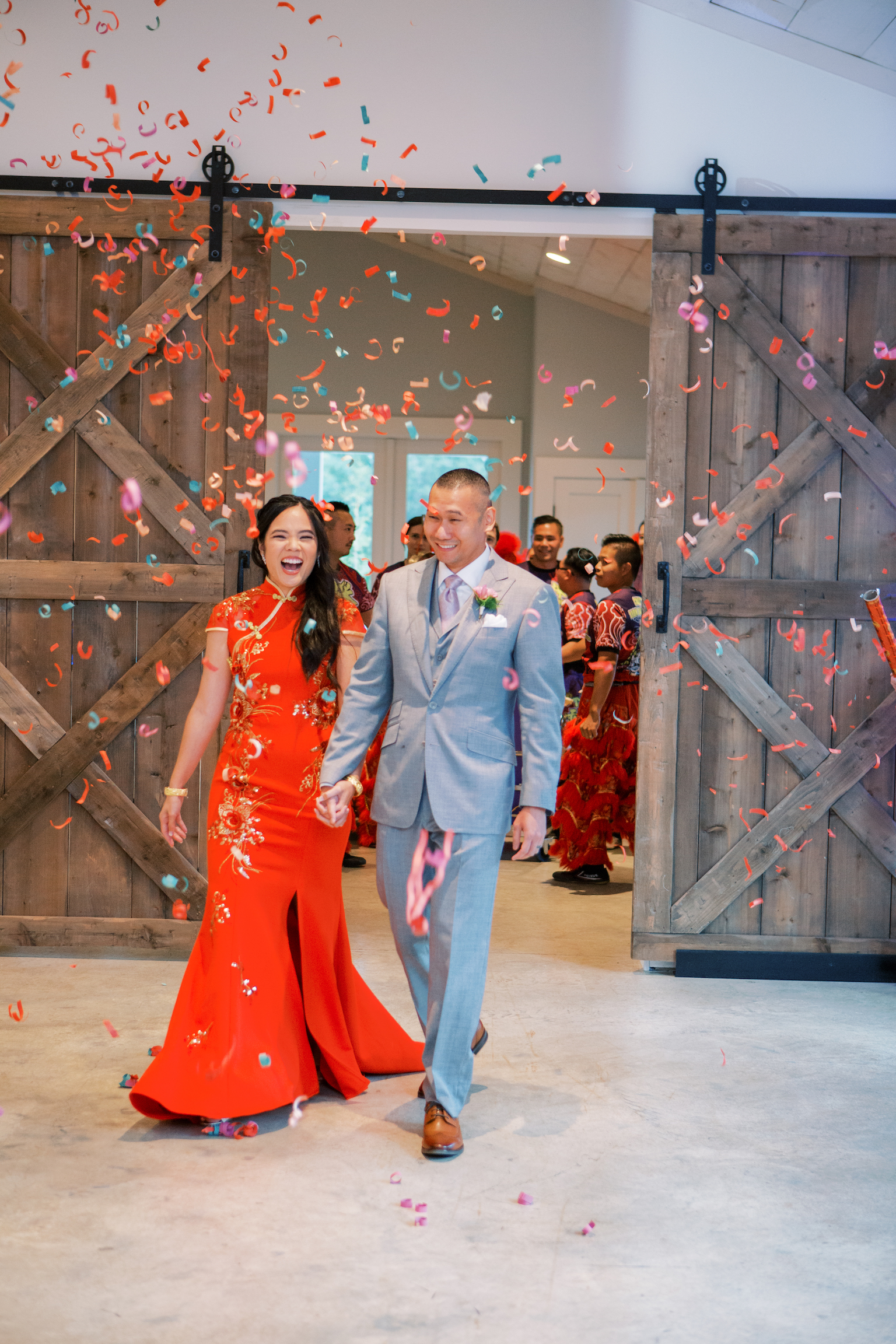 Phoebe says her favorite detail of the August wedding day was the blending of the Eastern and Western cultures—nods to Chinese culture were sprinkled throughout, including the Chinese symbol for “double happiness” on programs, menu cards, signs, and more; and a traditional Chinese lion dance—for a “modern Asian wedding feel.” Lee’s favorite part was the traditional tea ceremony the day before, which he says was intimate and allowed the pair to pay respects to their parents and family.