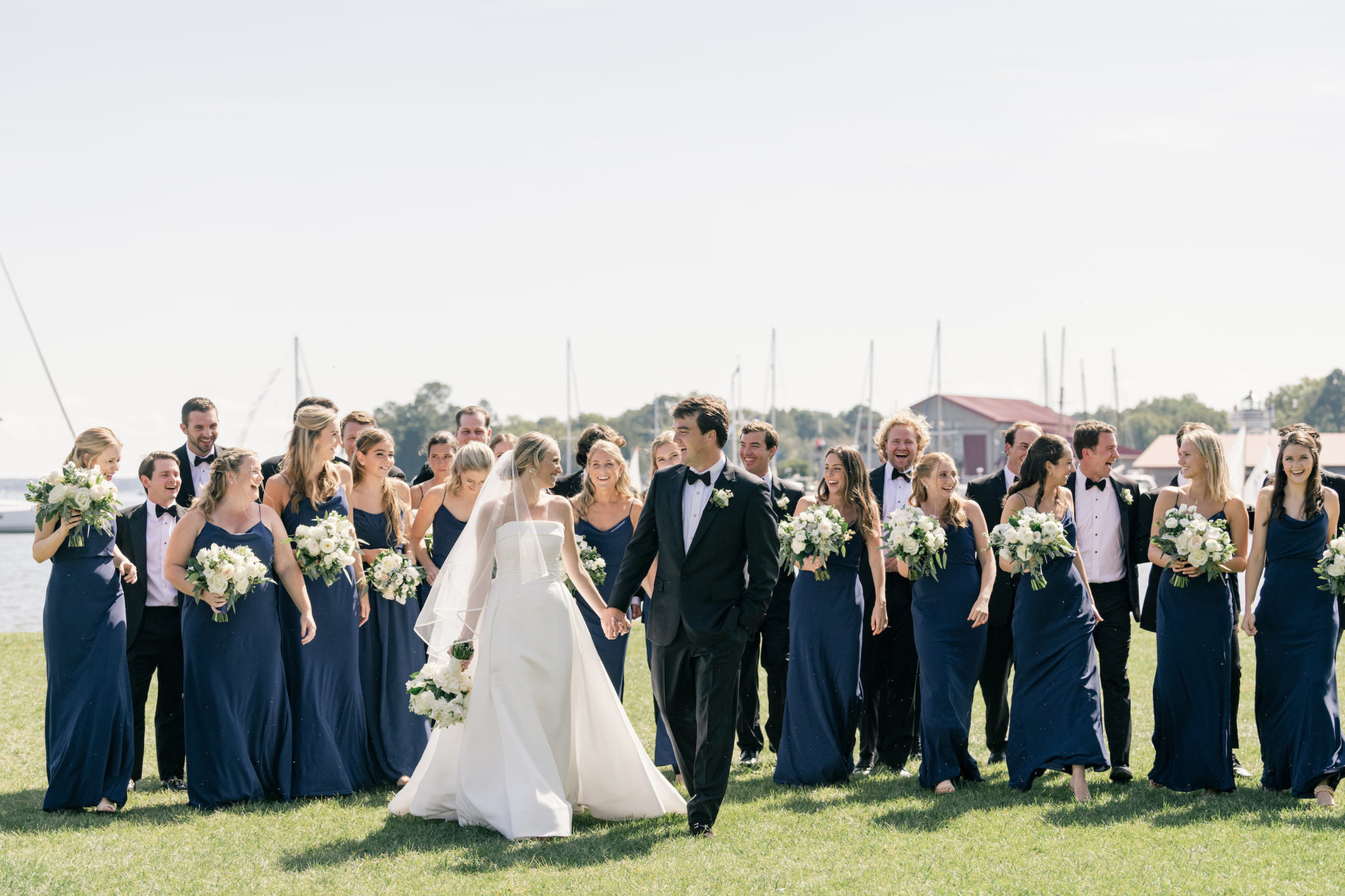 Caitlin’s favorite part of the day was the white and green flowers, which she says complemented the nautical blues and waterfront. Rob’s favorite part was the old-fashioned Bentley that drove the newlyweds from the church to the reception, allowing them a moment to celebrate their newlywed status with a glass of Champagne.
