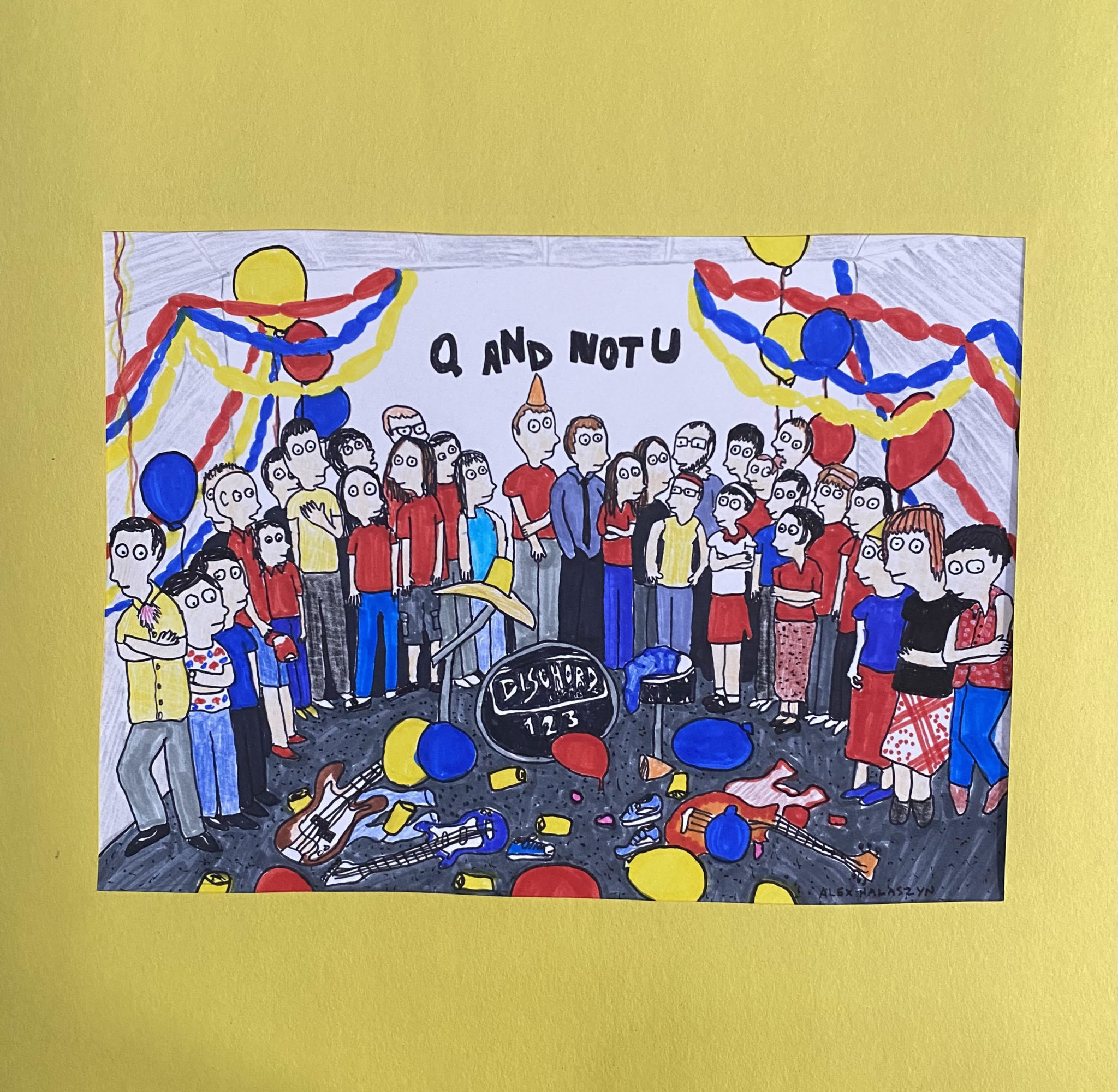 Halaszyn has recreated 18 twelve-inch records and at least eight singles for the show. He hopes to encounter some more people with connections to the music that inspired him during the two hours on Saturday when the whole show will be live. Wouldn’t it be amazing, he says, if any of the 30 or so people on the cover of Q and Not U’s 2000 LP No Kill No Beep Beep happened by? It’s possible! “Seeing all of these faces I love so dearly rendered in Alex’s instantly recognizable style is a damn trip,” says the band’s Chris Richards, who now works at the Washington Post.