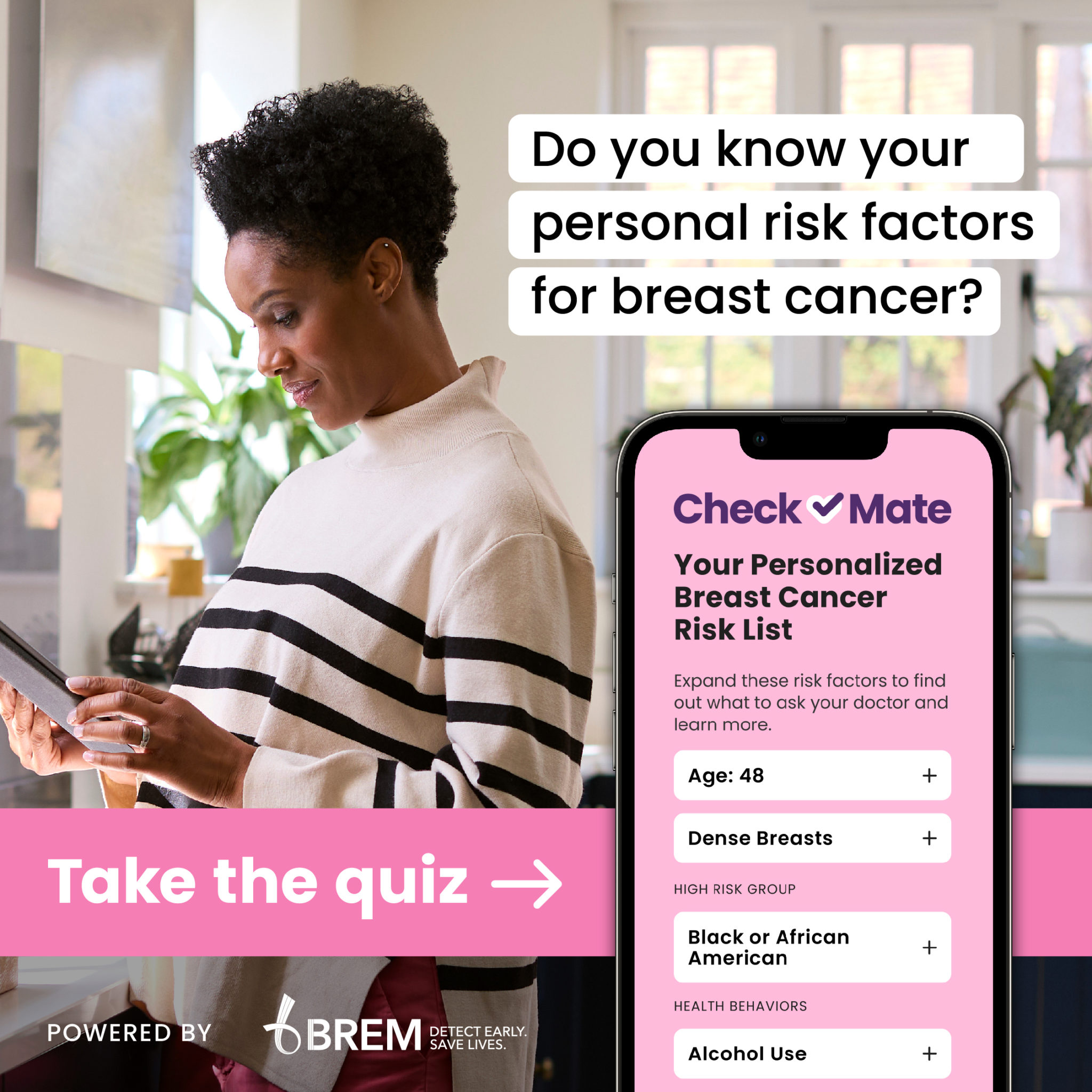 As part of Breast Cancer Awareness Month, Silver Spring’s Brem Foundation—whose mission is to help women beat breast cancer through early detection—just launched a new online tool designed to help women better understand their risk. The online quiz, called CheckMate, asks users a series of questions, offering background information about the relevance of various factors along the way, and then (after quiz-takers provide a name and email address) emails a list of the quiz-taker’s risk factors, along with a set of questions patients should ask their medical provider at their next visit.