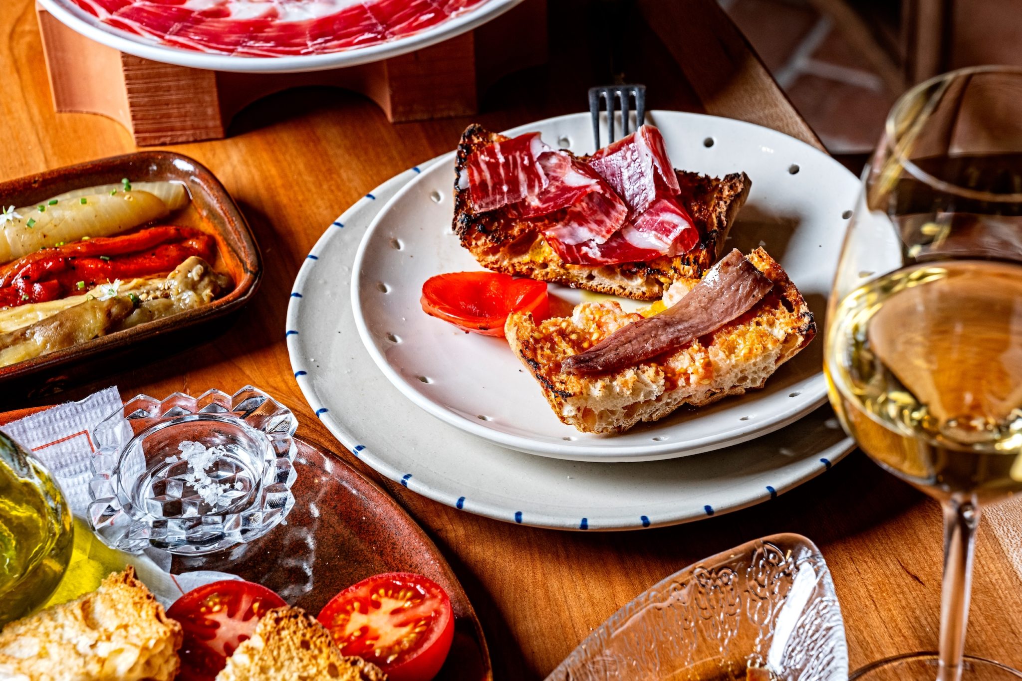 Start with pa amb tomàquet, a build-your-own version of Catalan tomato bread. The dish comes with toasted pan de cristal bread (imported par-baked from Barcelona then finished in-house) and slices of tomato to rub on top. Diners then finish it with olive oil and salt. The dining room will also have a jamón cart to slice up cured meat to order. Garcia notes that carving jamón is its own profession in Spain, so he’s hired some pros who will also teach the staff “like a carving jamón university.”