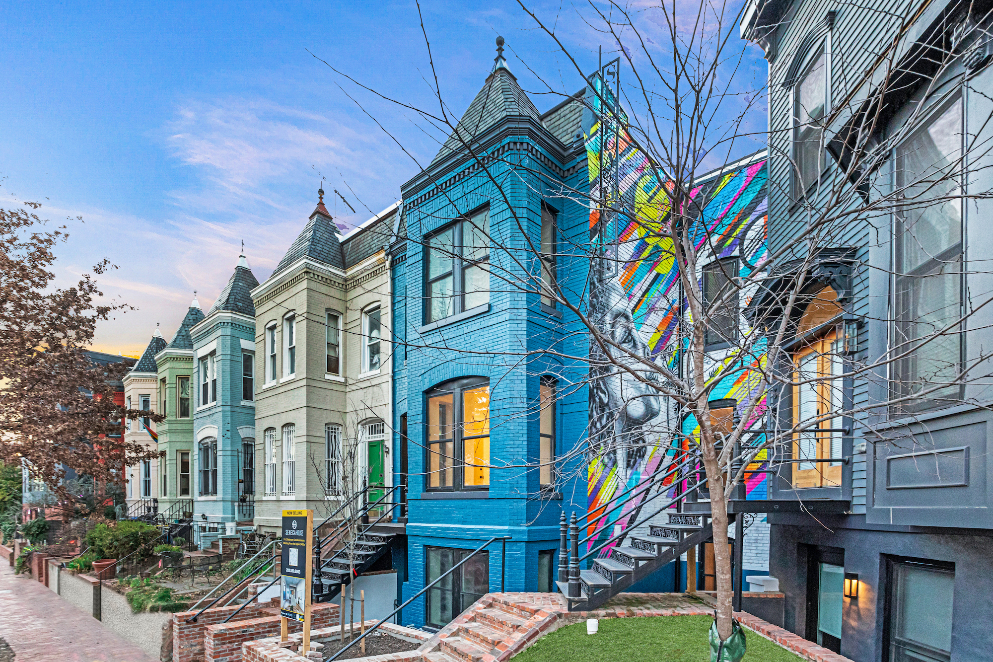 The exterior of this modern two-bedroom, one-bathroom basement unit features a colorful mural by artist Hamilton Glass. Inside, you’ll find in-unit laundry, quartz countertops, and Bosch appliances. Plus, there’s a private terrace.