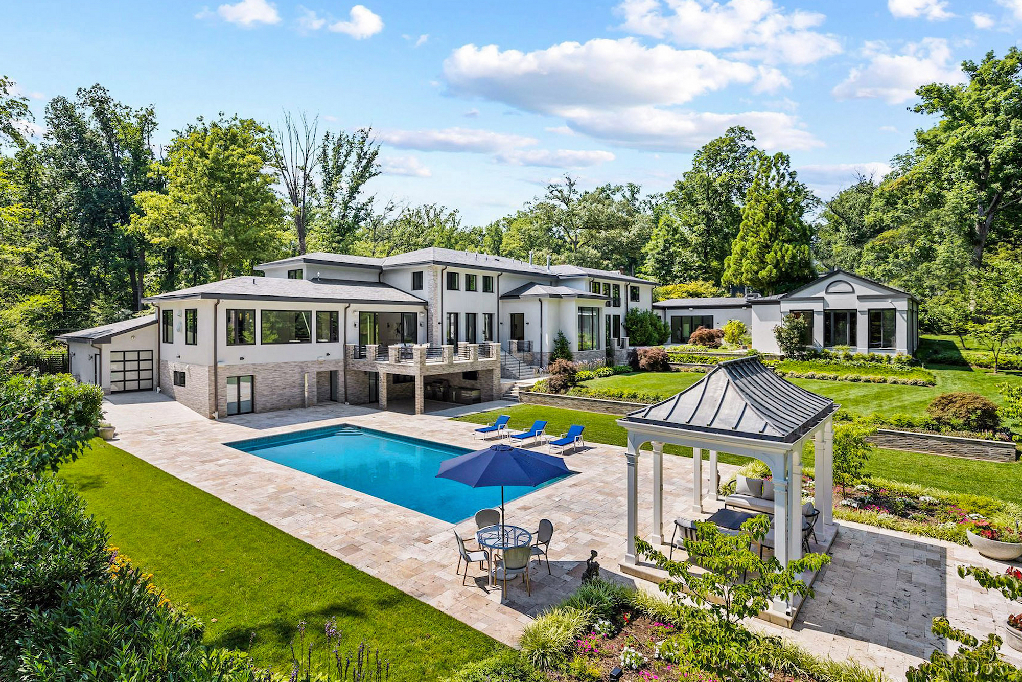 Located in Bradley Hills Grove, this grand residence has six bedrooms and nine bathrooms in its 15,000 square feet. Highlights include a spa bath, indoor and outdoor pools, two elevators, and a three-car garage.