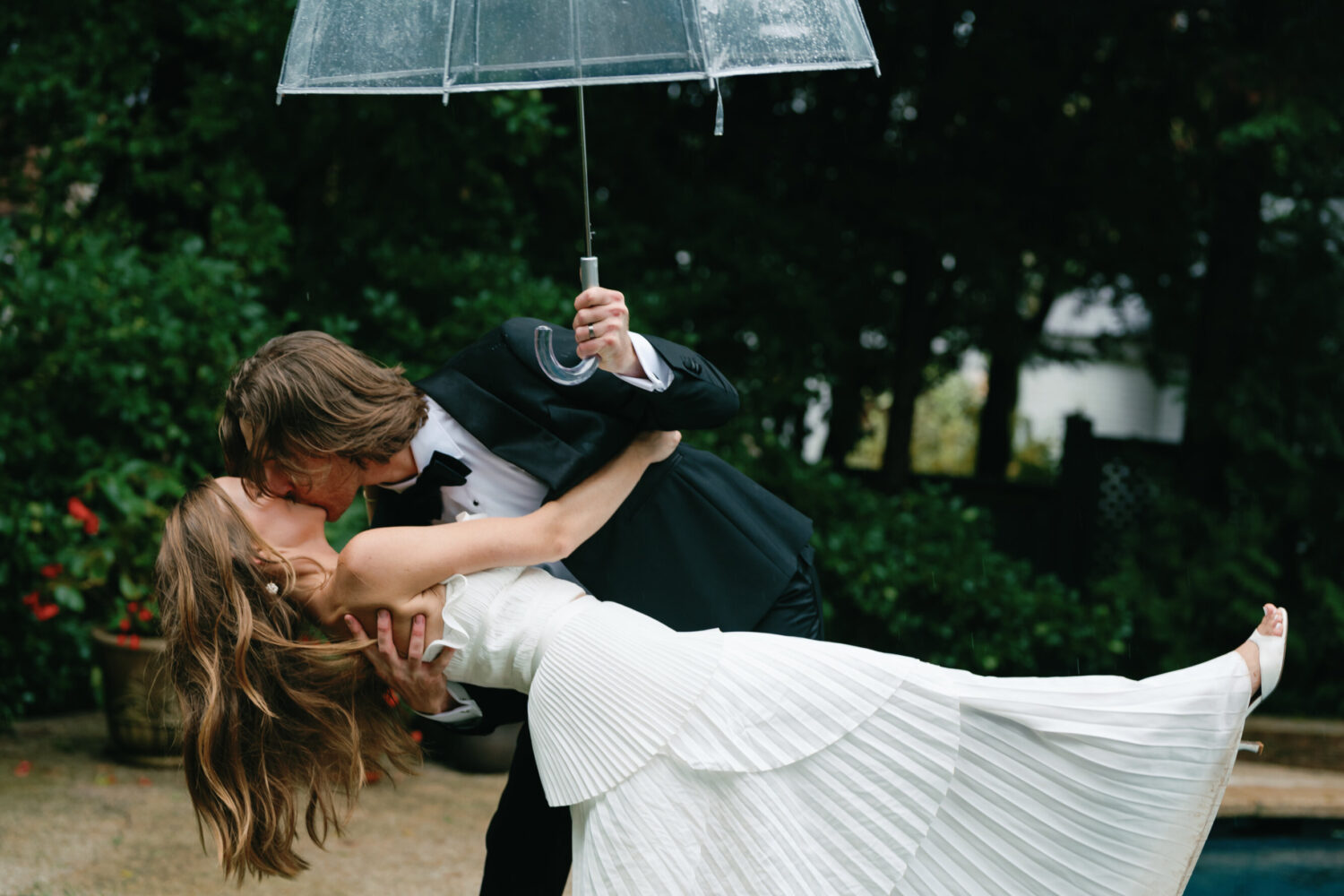 As for the wedding attire, the bride paired a Savannah Miller gown with her bridesmaids emerald-colored gowns, and the groom wore an Indochino suit inscribed with the wedding date, and fleur de lis-printed socks.