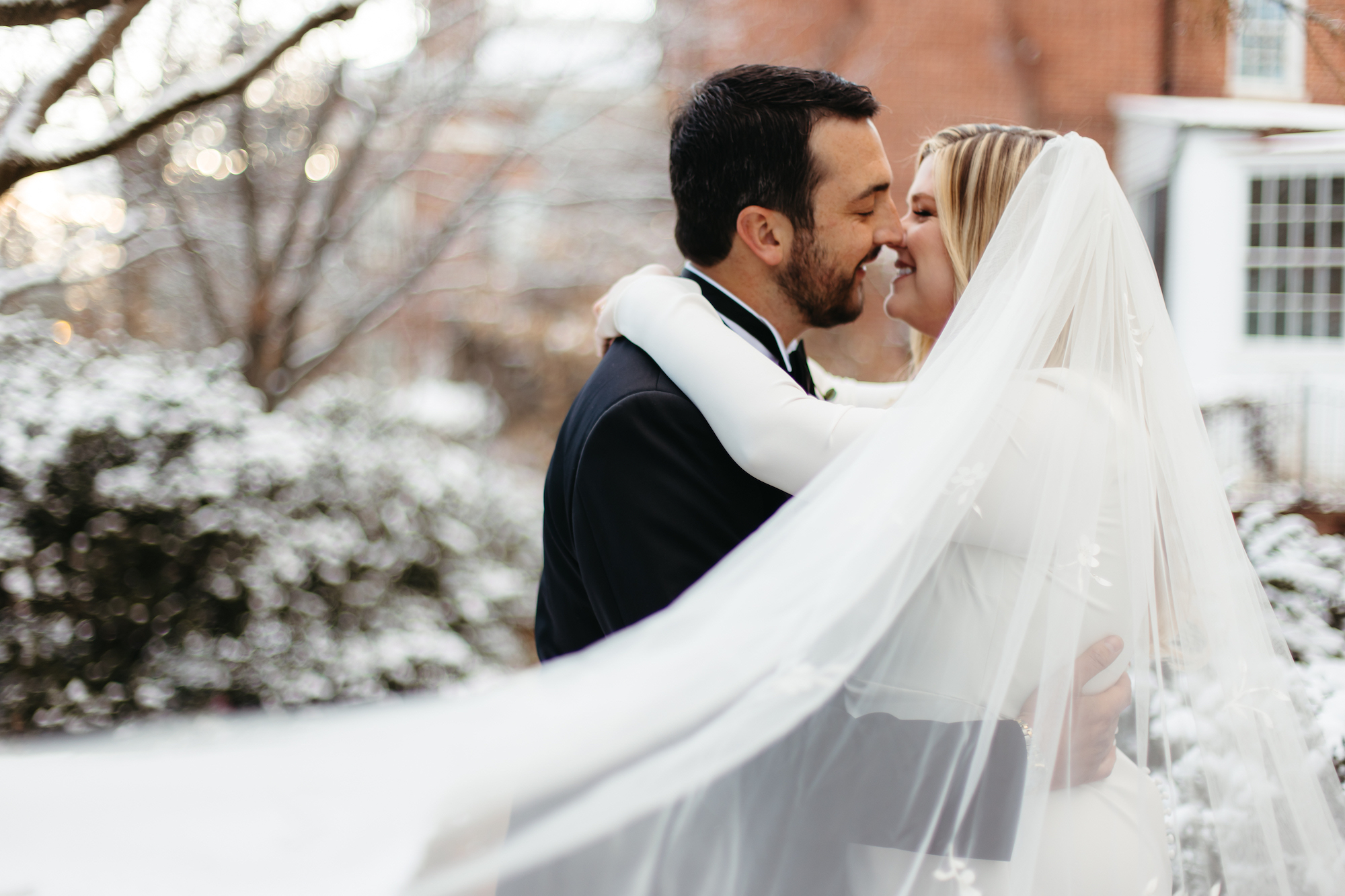 Katherine and Nicholas married on a snowy March day at the historic Dumbarton House. Even though these two Southern California natives weren’t expecting a snowstorm on the day of their nuptials, it ended up being the perfect surprise. With the help of their vendor team, they were able to stick to their initial plans for an outdoor ceremony by securing additional tents and passing out hand-warmers as favors. Following the snowy ceremony, guests were invited inside the charming Dumbarton House for the reception, which Katherine says needed little decor to create their ideal wedding aesthetic. “We opted for simple, elegant details that paired with the historic venue but did not detract from its beauty,” says Katherine. Their florist also incorporated soft white roses, anemones, and ranunculus, with greenery to enhance the reception space.
