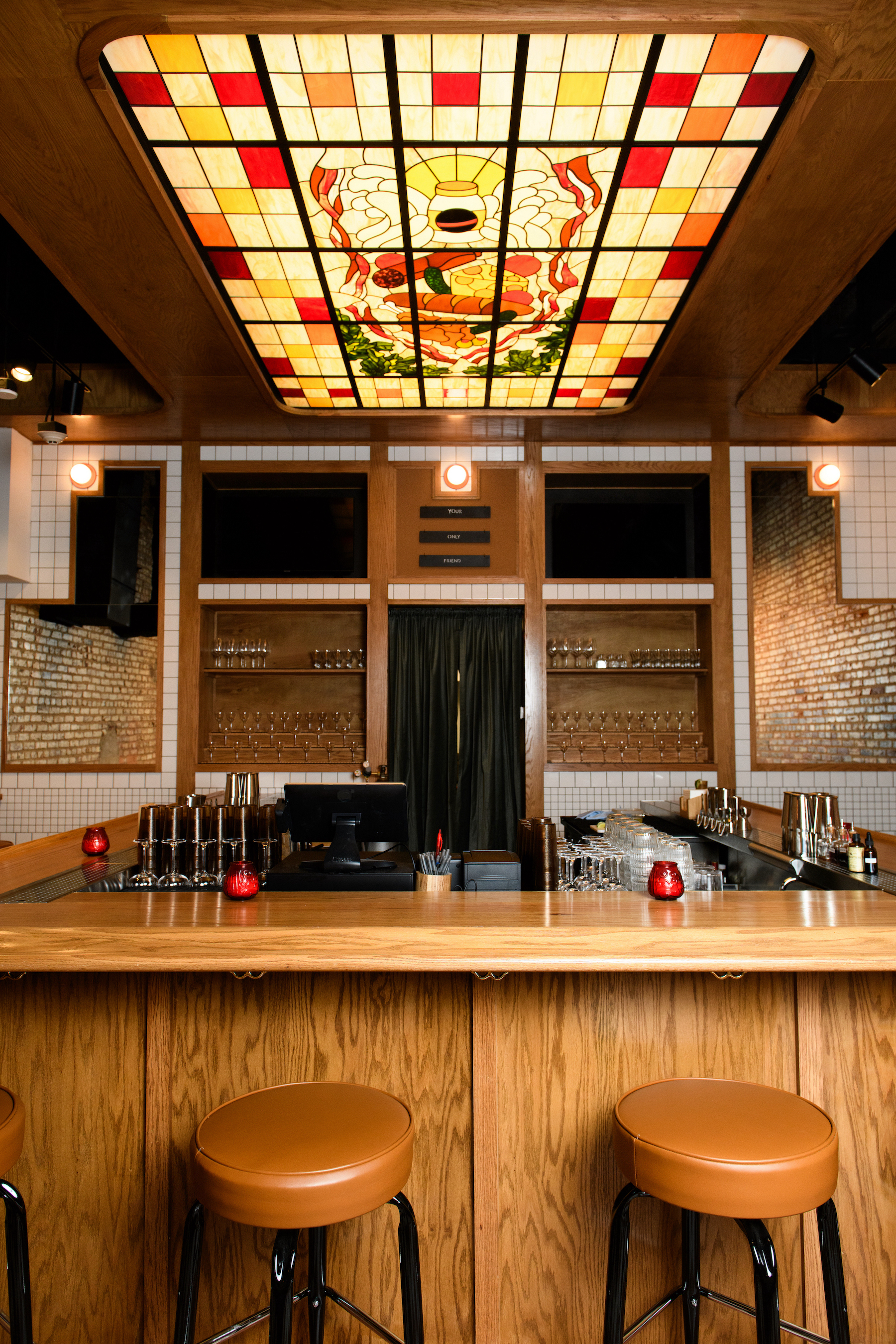 A jar of Duke’s Mayo depicted in stained glass glows from the ceiling of Shaw bar Your Only Friend. It’s a fitting beacon for the city’s newest place of worship for sandwiches and cocktails, and it opens today from Columbia Room alums Paul Taylor and Sherra Kurtz. The piece also perfectly captures the irreverent menu, which riffs off fast-food and casual-chain nostalgia while employing modern tools like a liquid-clarifying centrifuge.
