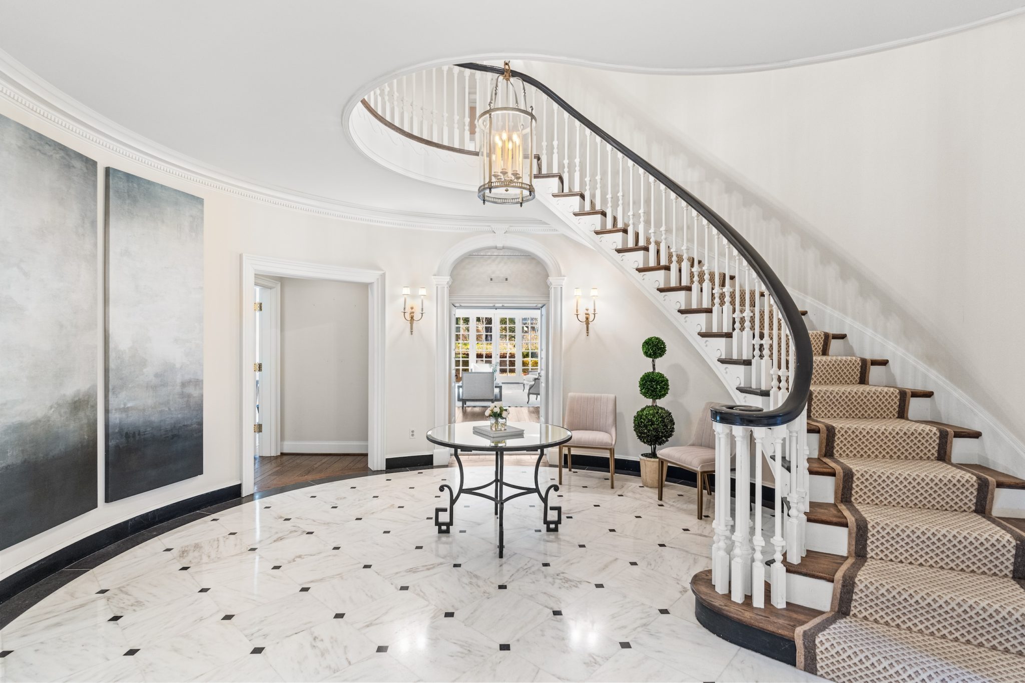 From the high ceilings to the wood-paneled library, this manor-style home radiates Old World charm. The dramatic foyer with curved walls has an elegant staircase that could be plucked from a Jane Austen novel. The home has boxwood gardens, a sunporch, a breakfast room, a catering kitchen, a pool house, tennis courts, a four-car garage and a motor court.