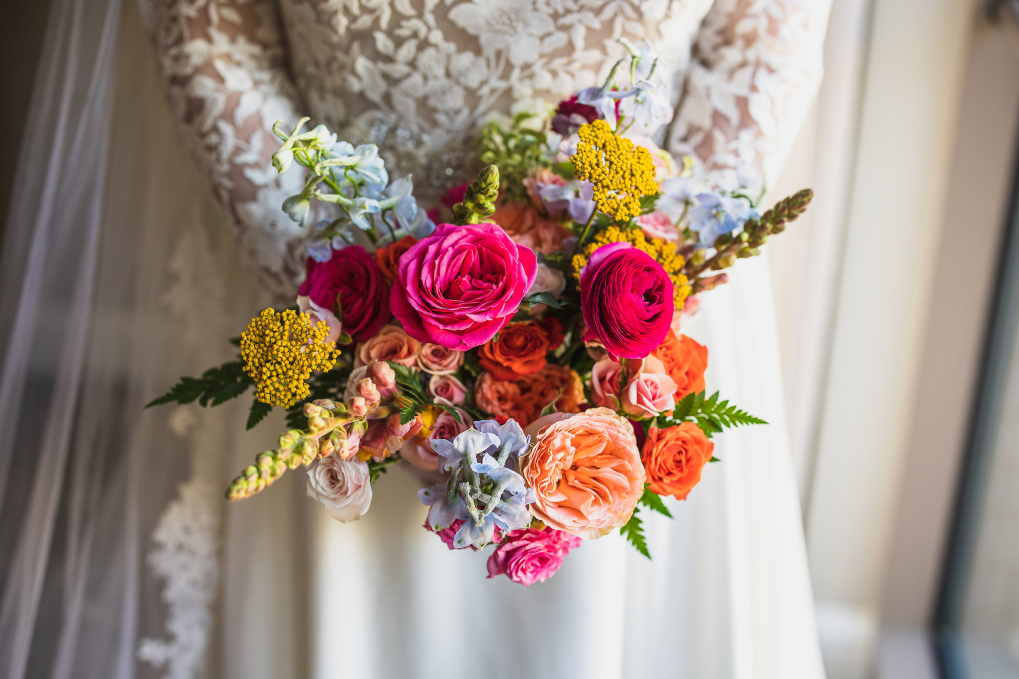 The goal for their January wedding, says the couple, was for the day to feel “open, airy, colorful, relaxed, and fun.” To accomplish that, they decorated the window-filled venue in shades of hot pink, fuchsia, and orange. A QR code encouraged guests to upload their photos to a shared album, and at the bar, there was a menu of mocktails—named after the couple’s pets—that guests could request spiked if they chose. Other fun details: the “Doctor Who Easter eggs,” they say, and the fuchsia Manolo Blahnik flats the bride says she’d long had her eye on.