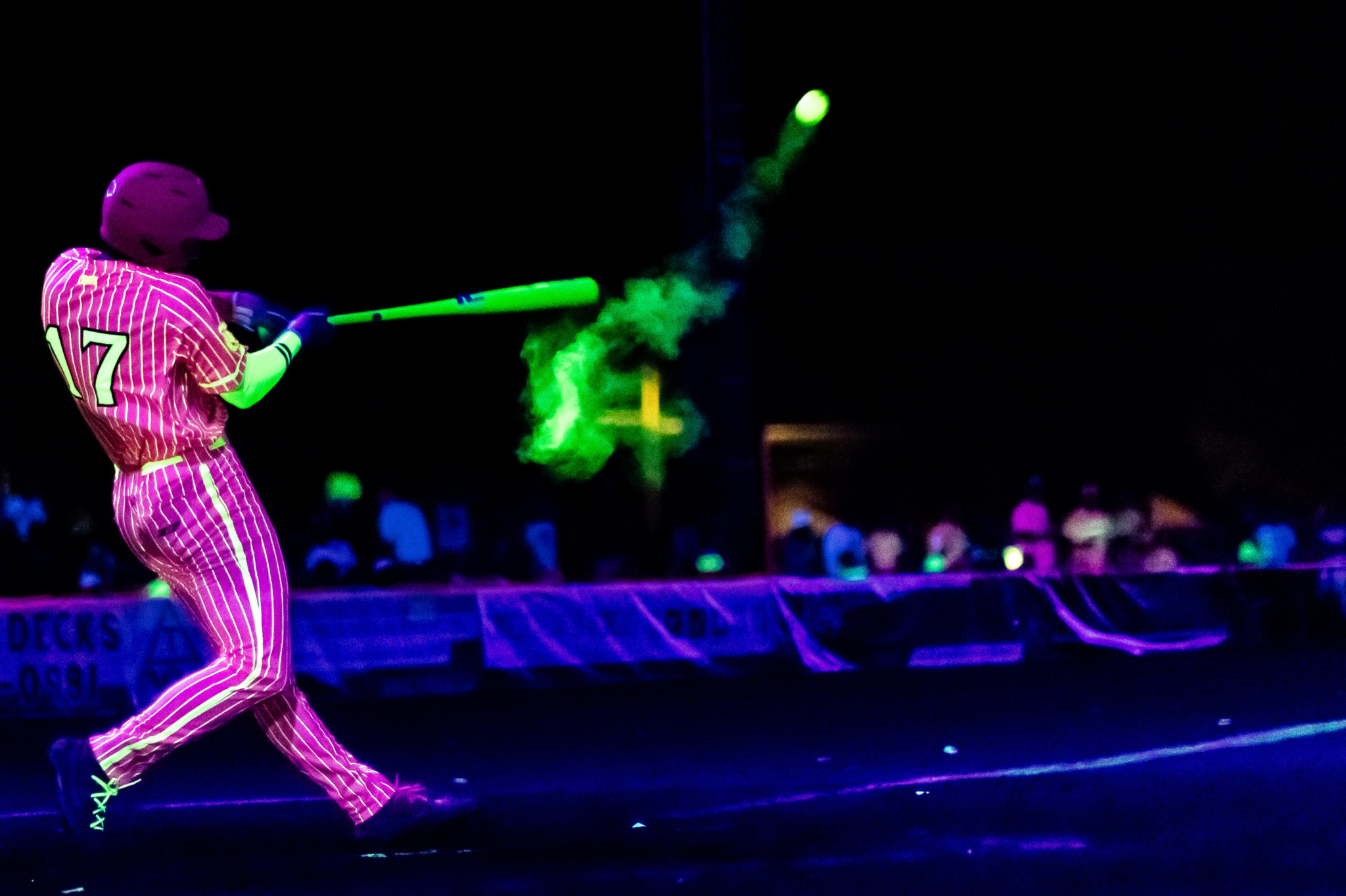 Following sunset before the first-ever cosmic game, the team’s announcer excitedly counted down to the grand reveal; the crowd burst into applause when the black lights came on and the stadium glowed in a radioactive palette of pinks and greens. The audience—many of whom were themselves aglow in the team’s official cosmic merch or other neon clothing—was a mix of locals and out-of-towners. “Some people told me they drove over to 6 hours to be there, and others even flew in” Martin says.