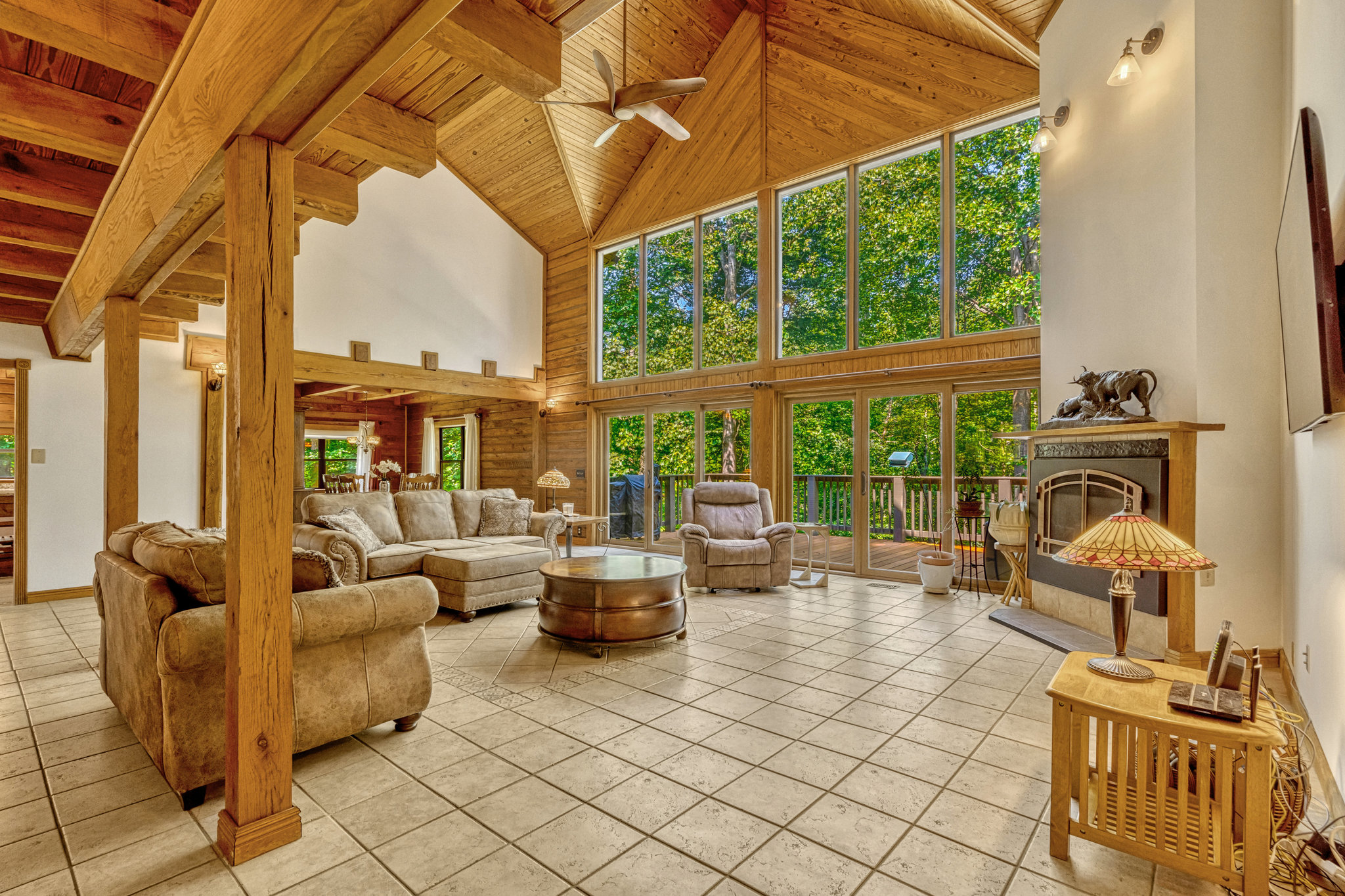 This log-cabin-style house sits on just over five acres of land. Inside, vaulted ceilings and detailed wooden fixtures give the home a naturalistic feel. The living room includes a gas fireplace, porch access, and windows with woodland views. Outside, you can access miles of forested walking trails that lead to Fountainhead Regional Park.