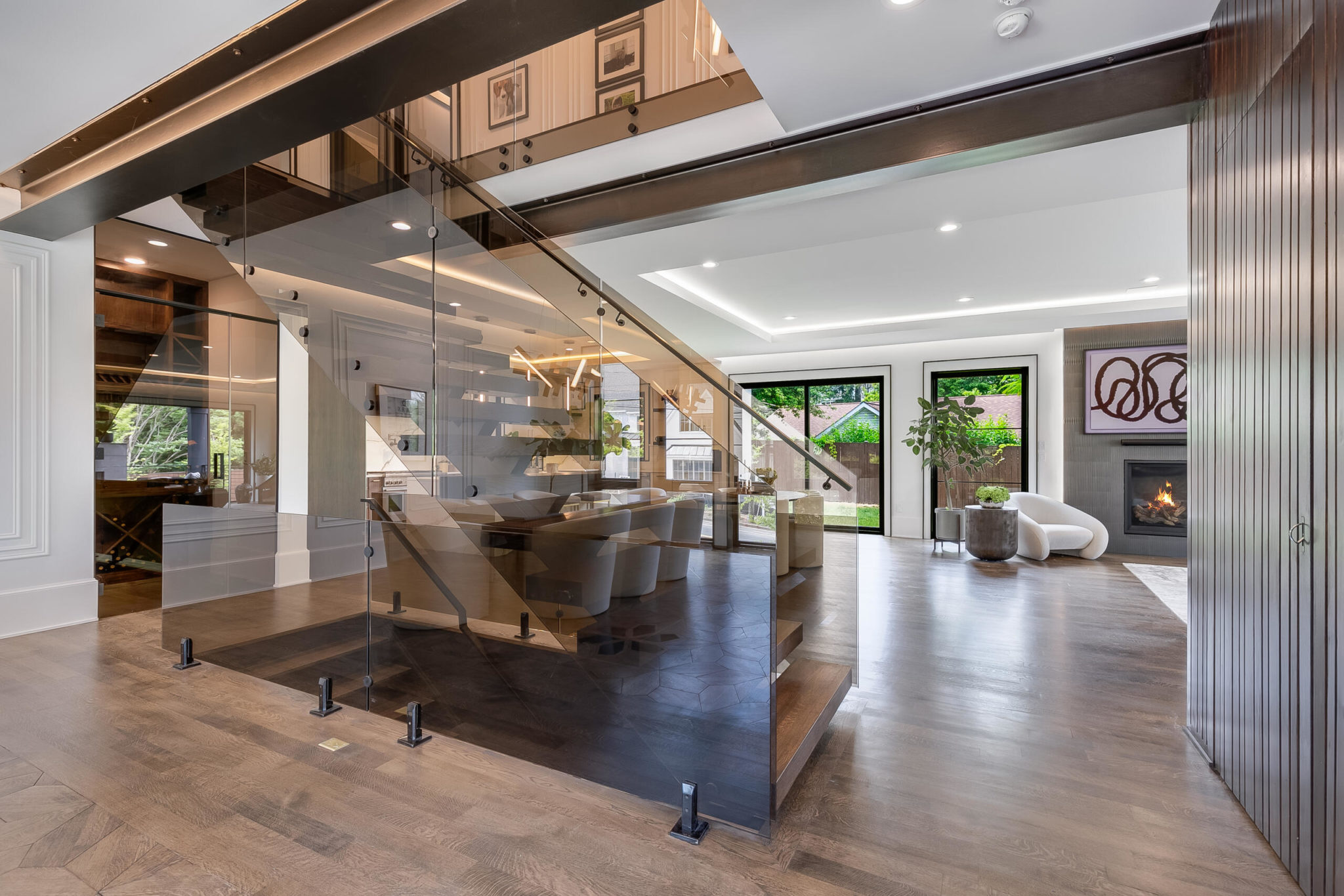 The house is four levels and 7,664 square feet. The renovation includes a complete revamp of the previously plain, finished basement, which now features a backlit bar, cushy seating area, private movie theater, and a gym.