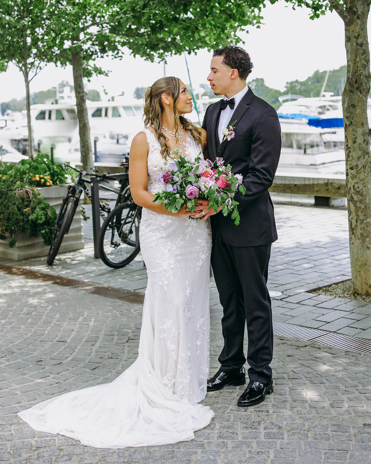 At their spring-themed wedding last June, the design included light colors—including lilac, gray, and cream—and floral patterns. Food was important, so they wanted for a restaurant venue, and chose La Vie, where they dined on brunch—including chicken and waffles, shrimp and grits, steak and eggs, Greek salad, seasonal fruit, and more—with a waterfront view. Following the big day, the newlyweds honeymooned in the Bahamas.
