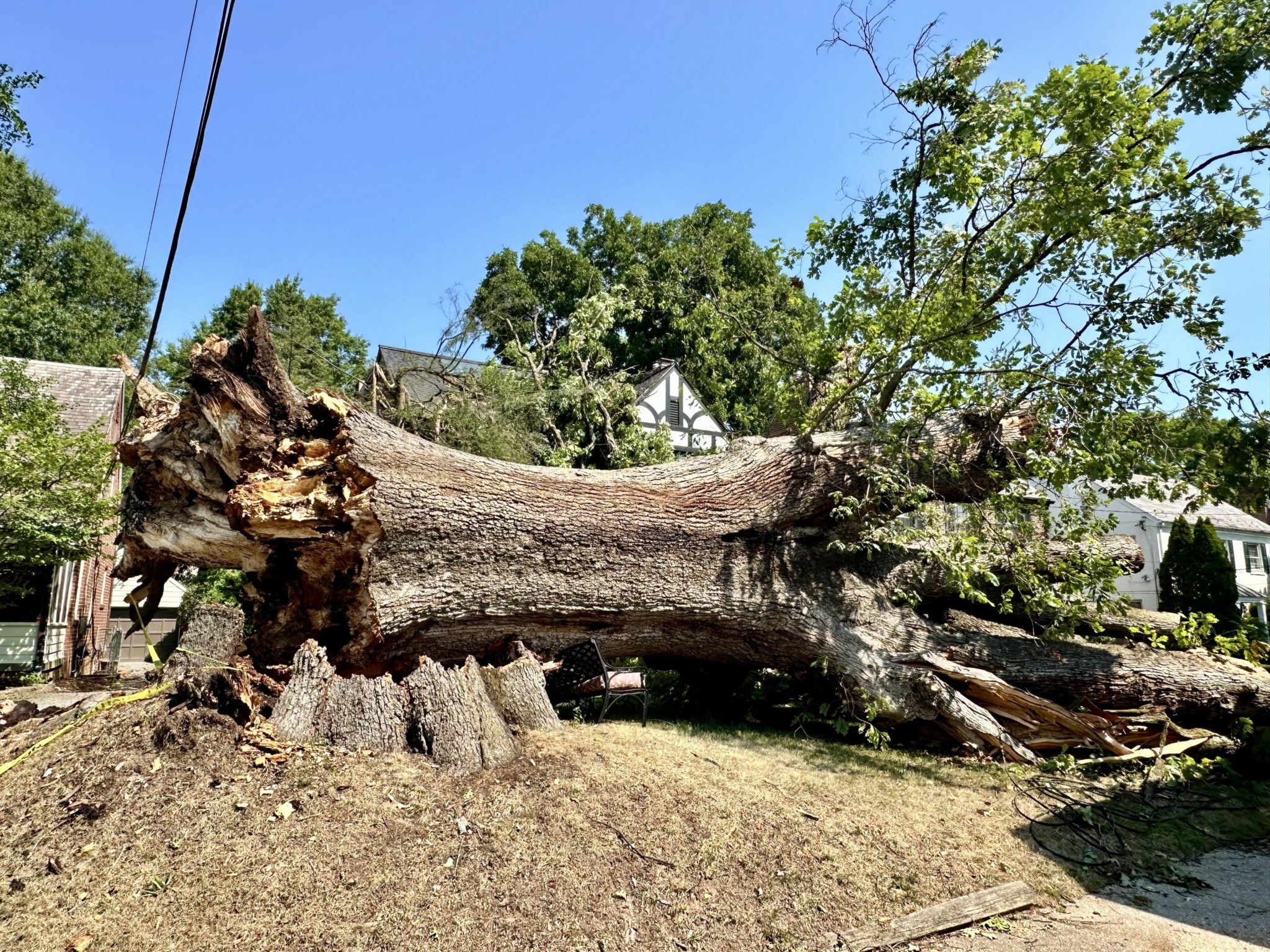 Correction: An earlier version of the story stated that the tree fell during storms that happened on Monday evening. However, the tree’s neighbor, Gary Thompson, says he heard it fall on Monday morning, shortly before noon.