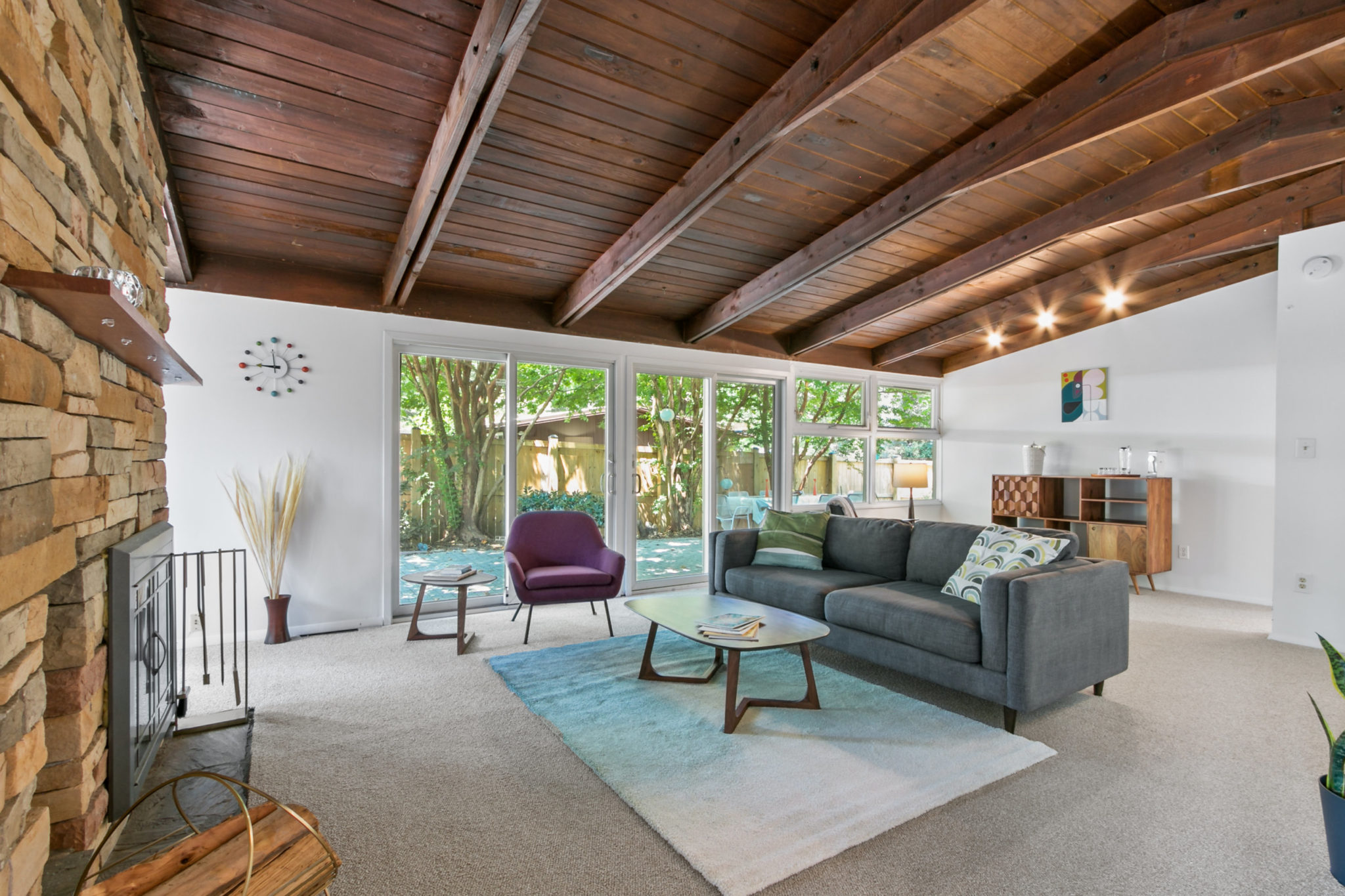 Wooden cathedral ceilings, a brick fireplace, and floor-to-ceiling windows give this 1952 home a unique charm. Outside, a fenced-in yard and landscaped patios provide space for entertaining. The historic neighborhood also features a community pool, a fitness center, and easy access to the Dunn Loring Metro stop and the Custis trail.