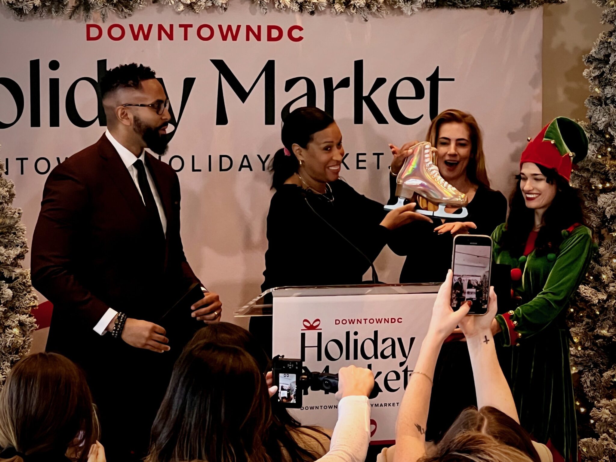 The rink will welcome skaters from December 16 to January 4, and more new attractions are planned, like a “National Mistletoe” by artist My Ly at Anthem Row, formerly Techworld Plaza. There’s a national Christmas tree downtown, BID president Gerren Price said at the event, so why not a national mistletoe? Other stuff outside the market includes the return of “Frosted at Franklin Park,” a light and sculpture installation.