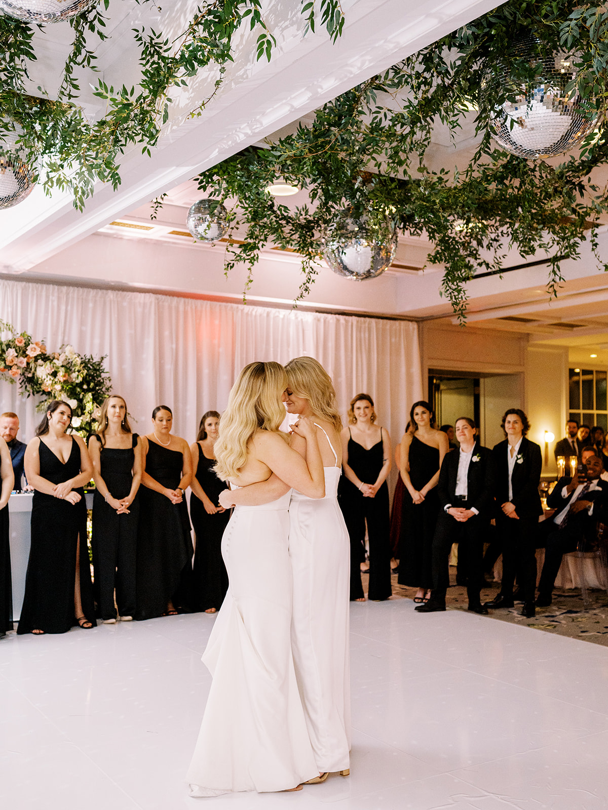 Their “garden disco” wedding, which they wanted to feel “modern, feminine, and floral,” was decorated in shades of mauve and blush, with black, white, and iridescent accents—plus plenty of greenery, including a foliage-and-disco-ball installation that hung over the ballroom reception and was Helena’s favorite detail of the day. The head table—with its iridescent linens, florals, candlelight, and mini mirrored balls—was Amanda’s favorite. Other special elements were the follow the call of the disco ball seating chart and a disco-ball Champagne tower in lieu of signature cocktails.