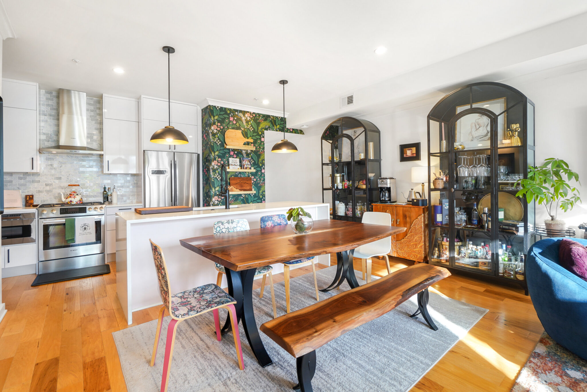 The penthouse unit in a 1917 rowhouse underwent a major renovation in 2018. It boasts floor-to-ceiling windows, upgraded kitchen appliances, and two private parking spots with an EV charger. Two private terraces (one with a retractable awing) and a shared yard round out the outdoor amenities.