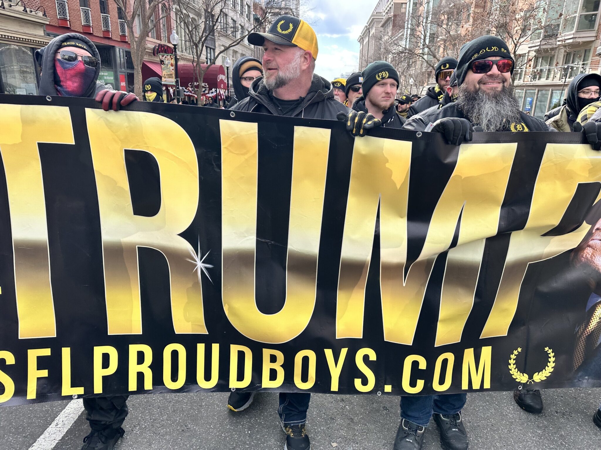 Patrons at bars booed former President Biden, former Vice President Harris, and their families when they saw them onscreen. Four years ago, people at Black Lives Matter Plaza sang “Na Na Hey Hey Kiss Him Goodbye” when Trump’s helicopter left DC; on Monday people at Capital One sang the lyrics to Harris. Nearby, members of the Proud Boys carried a large banner that seemed to portend the end of far right groups’ fear of entering DC after January 6.
