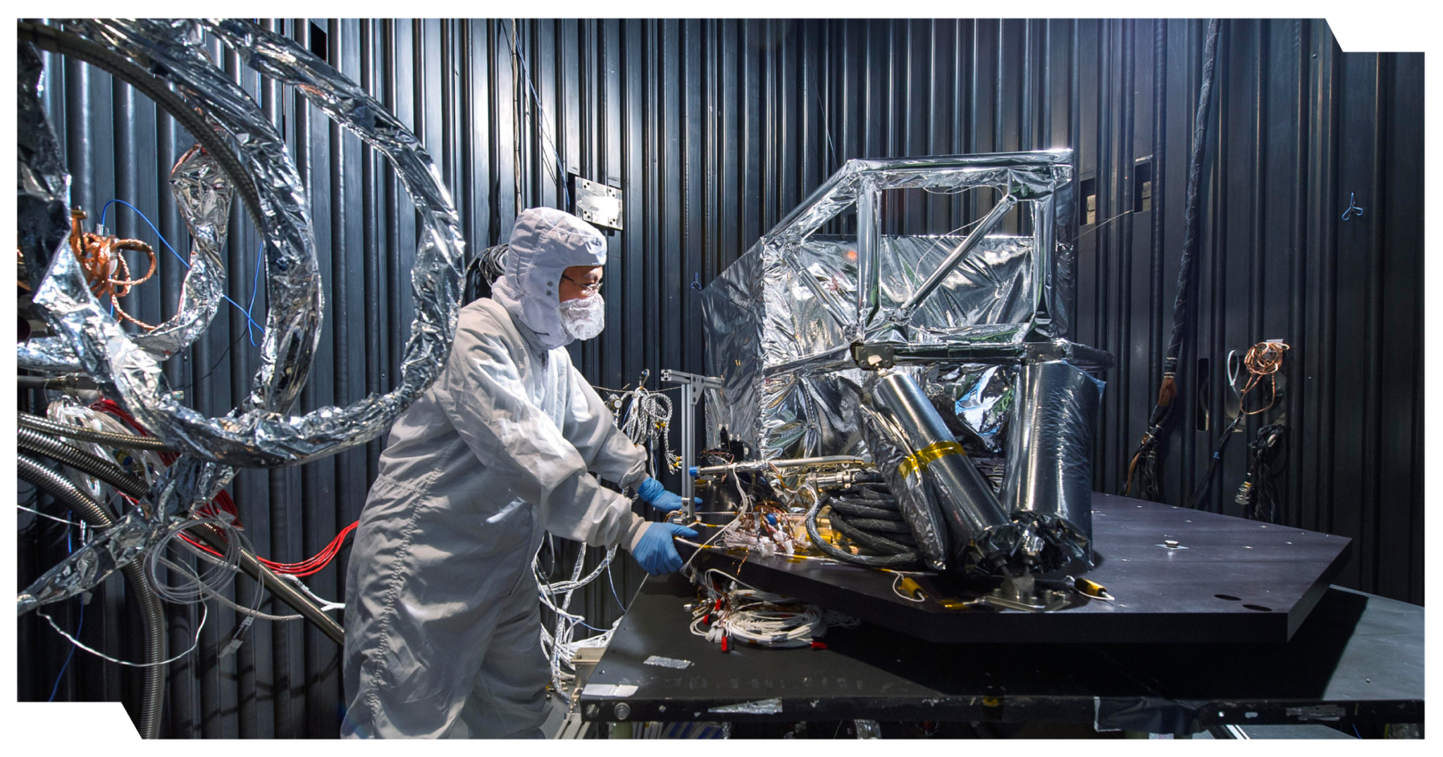 To ensure that equipment can function in the frigid, airless environment of outer space, Goddard workers use the Space Environment Simulator—a 40-foot-tall, 27-foot-wide chamber that, from the outside, looks like the world’s biggest and most hardcore Instant Pot and, on the inside, uses huge and powerful vacuum and liquid-nitrogen pumps to suck out all but the tiniest trace of air and atmospheric pressure. Contents such as components of the James Webb Space Telescope (right) are then subjected to temperatures ranging from 302 to 310 degrees below—or, in the case of the Webb telescope, minus 387 degrees via an extra helium shroud.