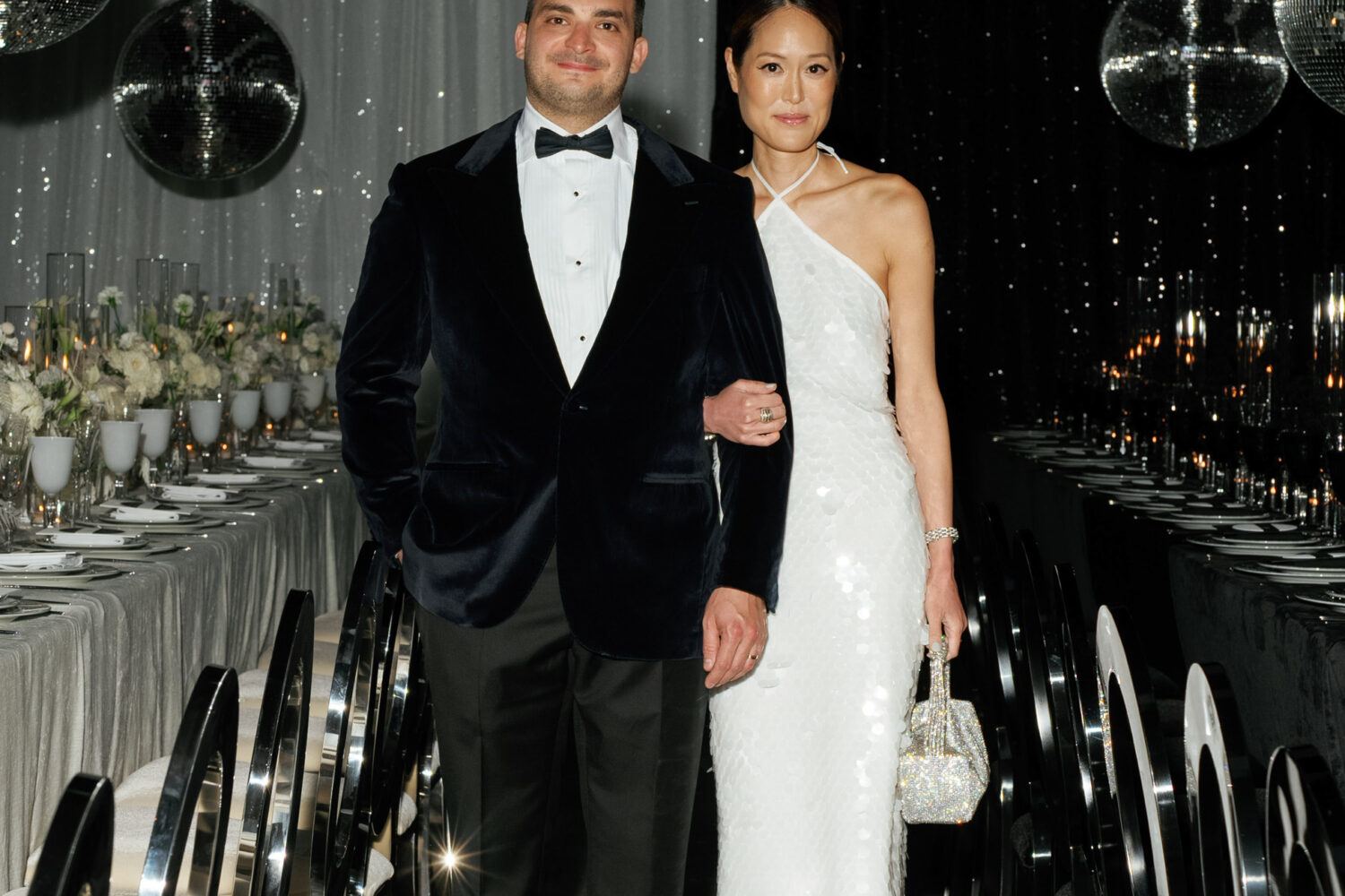 Inspired by the theme “a rainy Parisian night,” they celebrated with 260 guests at the Schuyler, the Hamilton Hotel’s two-story venue. The pair transformed the room with neutral shades of blush, white, and beige, elevating the setting with candlelight and cascades of dusty-rose draping. Loved ones stopped at a gold mirrored escort wall before taking their seats at tables decorated with white flowers—in bud vases and billowing centerpieces—and gold accents. Stephen’s favorite moment of the day: when the couple entered their reception to “The Next Episode” by Dr. Dre. After dinner, the newlyweds cut into a long, rectangular cake decorated with dried flowers in harvest colors.