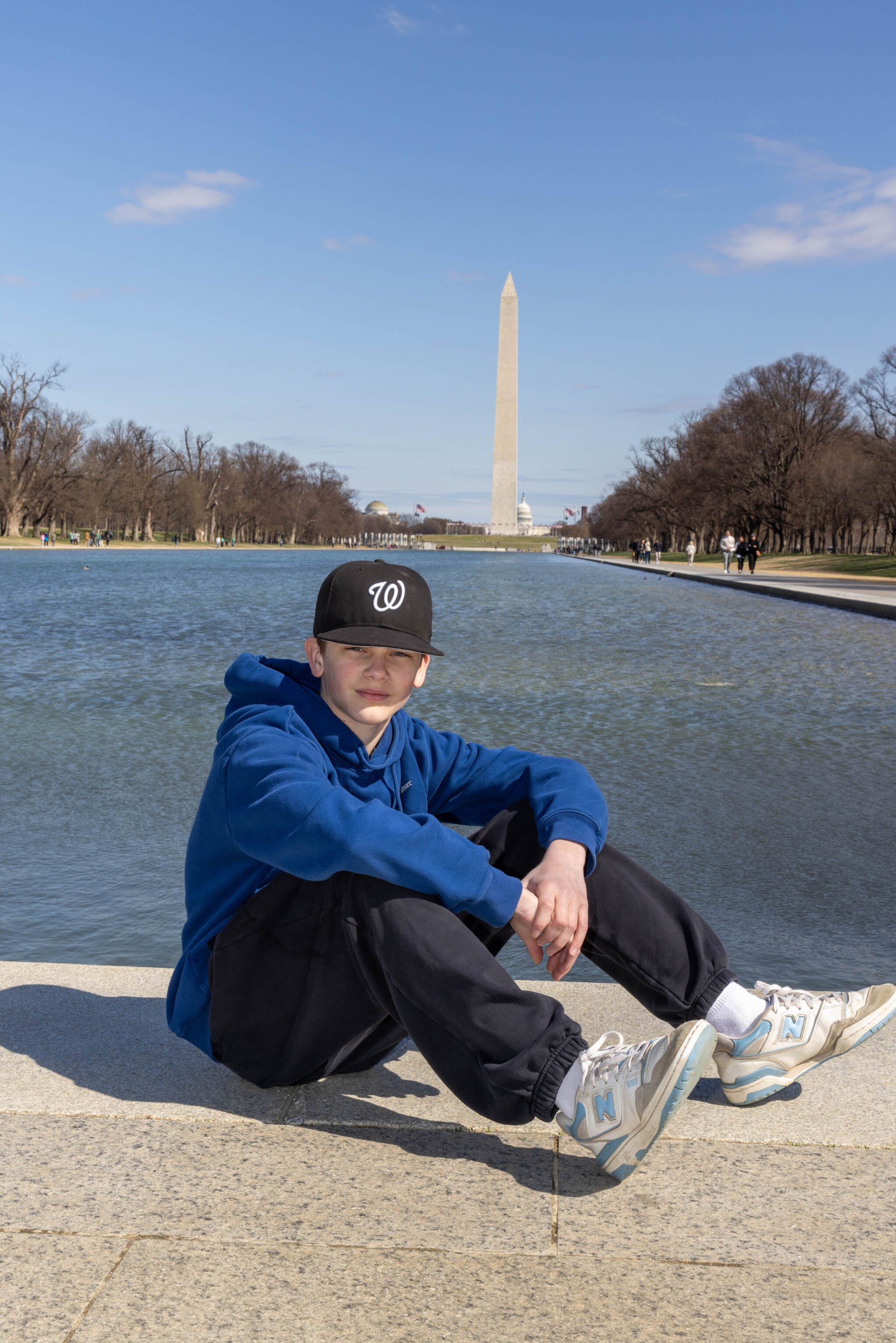 I met Lyndsey and Finley by the Reflecting Pool this past Monday afternoon. They were on a spring break visit to DC from Montana, where they moved in 2021. Finley is now 14 and plays baseball. He loves where he lives and enjoys visiting DC, where the family still has lots of friends. He was sporting a black Nationals cap and New Balance sneakers, DC’s unofficial shoes. The Reflecting Pool was full of water—the Park Service completed its maintenance in early March—and since we didn’t have a trebuchet handy, there was no chance Finley could re-create his famous jump, even if he’d wanted to.