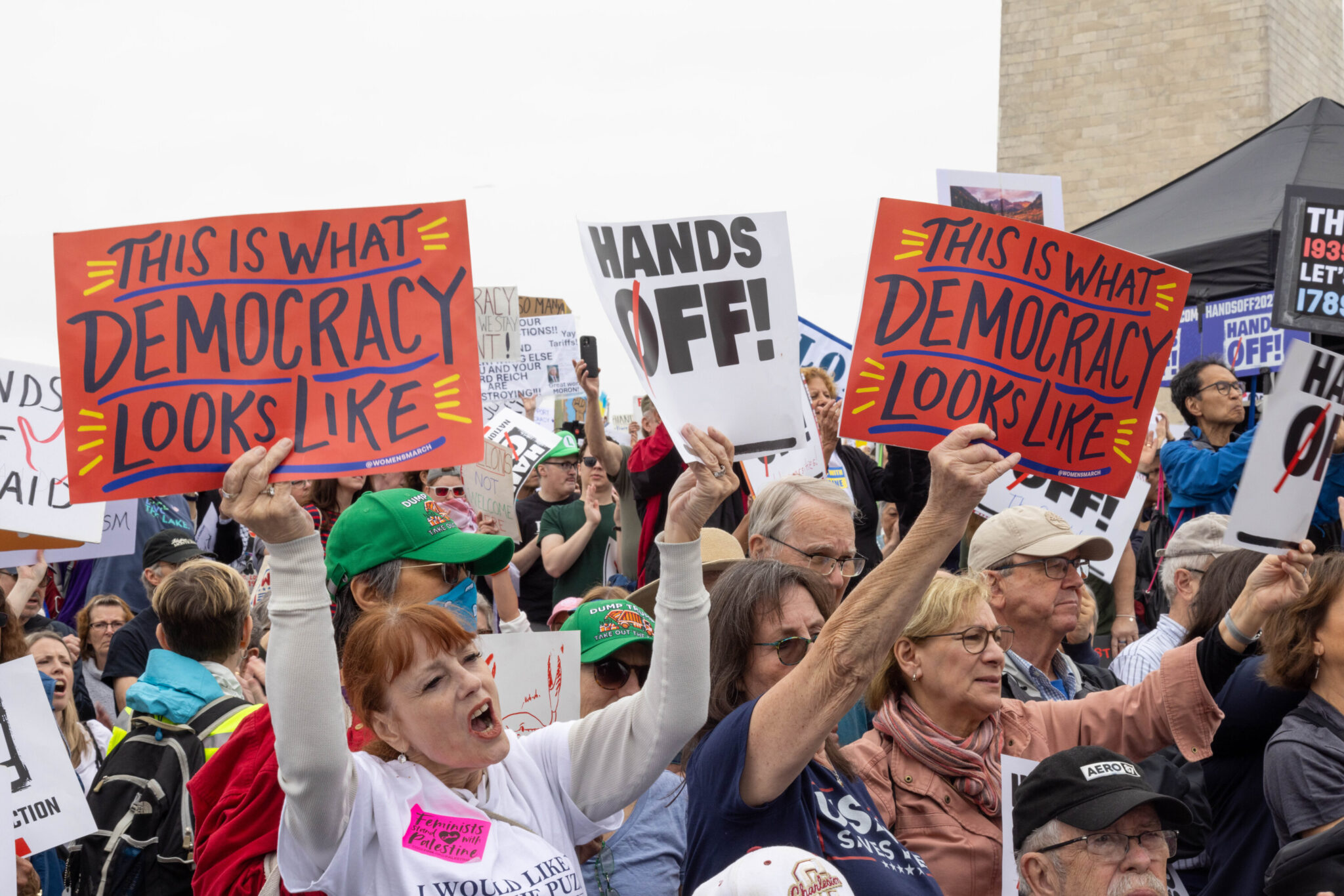 In what was billed as a “national day of action,” more than 1,300 “Hands Off!” protests took place in all 50 states as well as in other parts of the world on Saturday, April 5, with Washington, DC, serving as the flagship demonstration. Organizers expected some 20,000 participants in DC, gathered at the Sylvan Theater, at the base of the Washington Monument, to hear from speakers who included Representatives Jamie Raskin, Maxwell Frost, and Eric Swalwell, along with union leaders, protest organizers, and others. According to the Washington Post, organizers suspected that the crowd may have been five times that, and the White House had to postpone the White House garden tour due to the size of the Hands Off! protest.