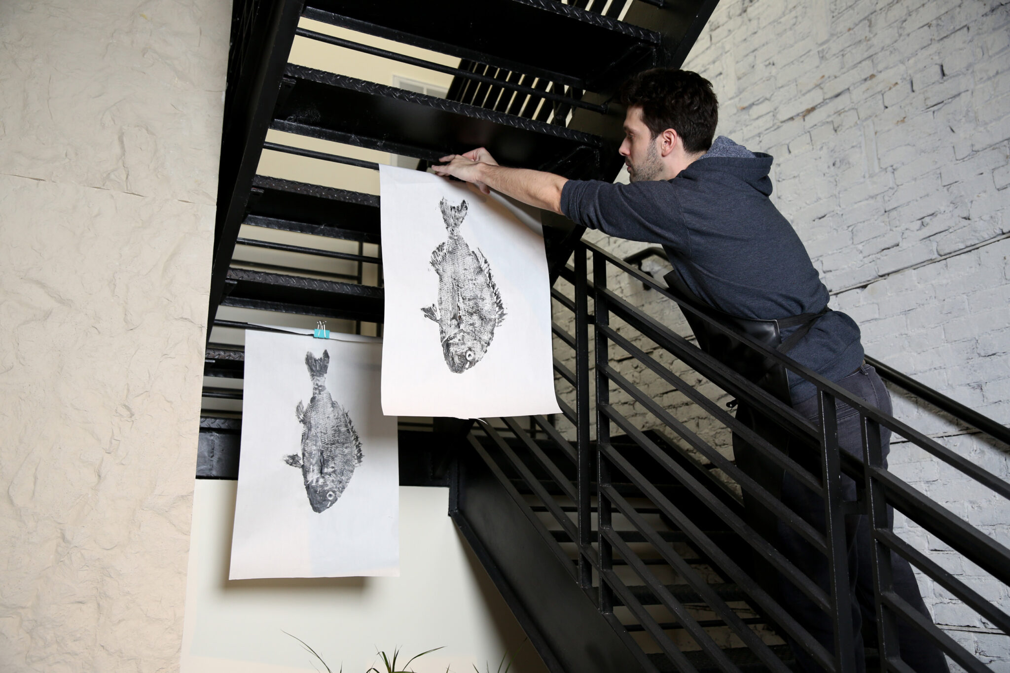 Enjamio hand-paints a pupil because the eyeball is too gelatinous to transfer ink. He’ll hang the print to dry under the stairwell before it joins a gallery of 15 or so others. He creates and adds a print whenever a new species of fish arrives at the restaurant. “Not to get morbid, but I want it to look like an edible Baltimore Aquarium,” he says. One of his most prized artworks is of a 200-pound tuna. A seafood wholesaler gave him special access to its Maryland tuna-processing facility to create the ink impression inside its cooler.