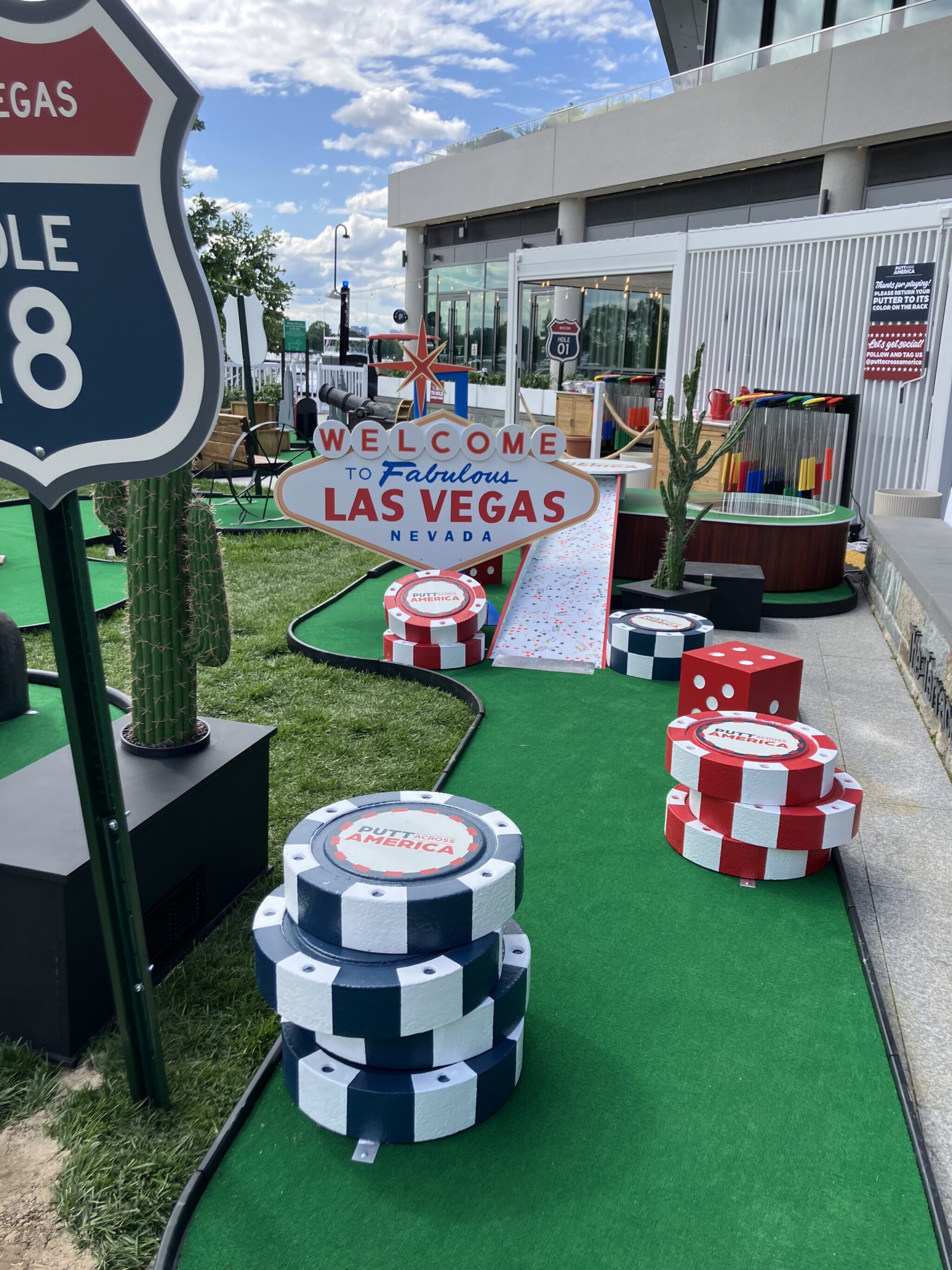 Just days later, I was emailed a press release for an Americana-themed mini-golf popup at the Wharf entitled “Putt Across America,” whose promotional copy included the phrase “from tee to shining tee.” I laughed, recoiled, and then immediately reserved a spot. Putt Across America was billed as an early celebration of America’s 250th birthday, which I was in too sour a mood to observe. But it seemed like a funny project. Could tapping a pocked ball into 18 America-themed holes while looking out at the Washington Channel make some kind of dent in my despair?
