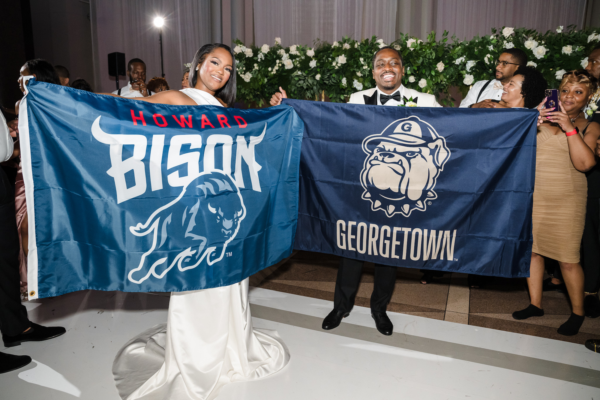 The pair say they prioritized the guest experience, including a welcome event at the Hamilton the night before where wedding “newspapers” offered an itinerary for the weekend, featured the wedding party, and included other fun shoutouts for guests, like the couple who traveled the farthest to attend the wedding. Shuttle service from there ceremony to the reception was another thoughtful touch. At the ceremony, their parents and grandparents walked them down the aisle, their godmothers read scriptures, and, before they “jumped the broom” at the end, K’sean says their mothers used the broom to “metaphorically sweep our past troubles away, giving us a clean slate for our new marriage.”