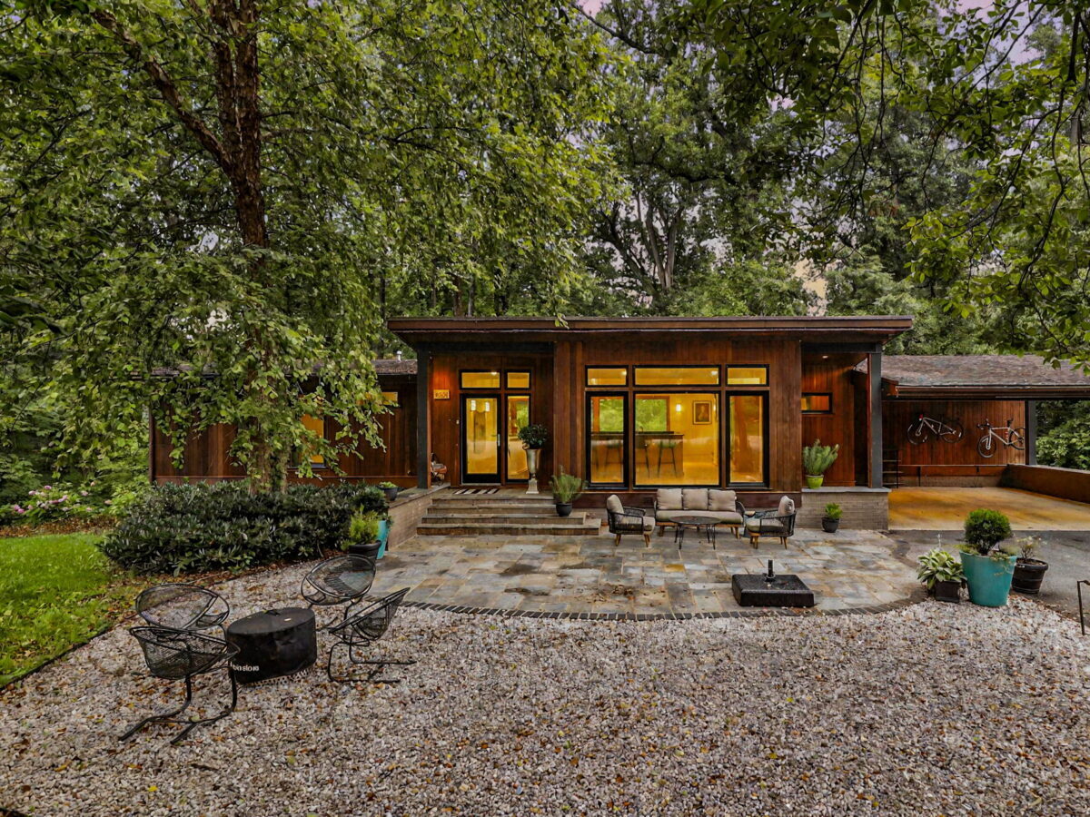This 1958 midcentury-modern house on a wooded lot has been renovated and sports floor-to-ceiling windows, multiple fireplaces, built-ins, and a two-car garage. The lower level includes a wet bar, a built-in desk, and two large storage rooms.