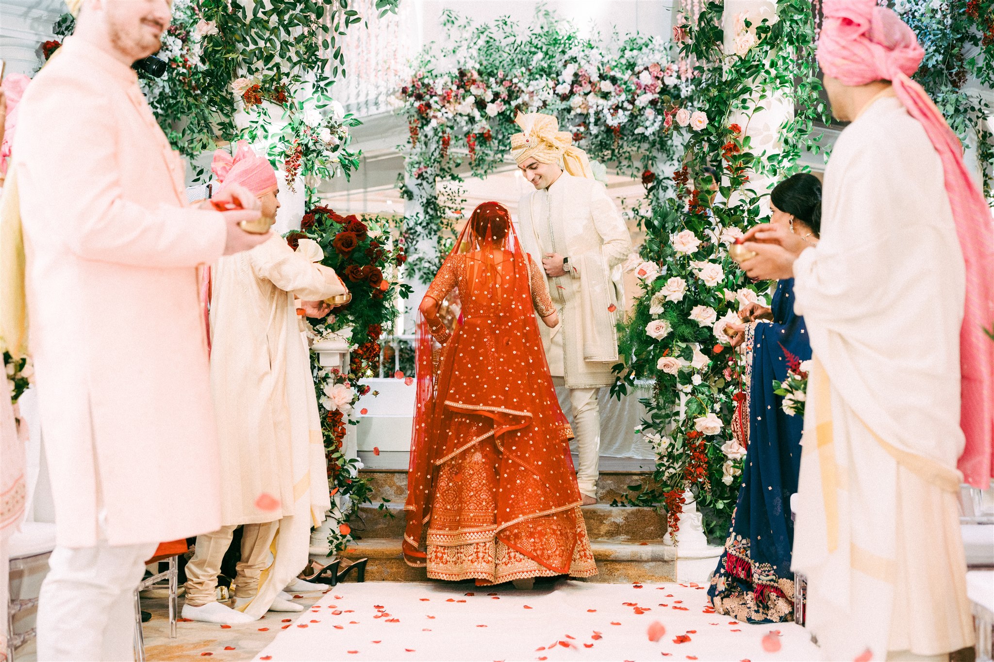For their November wedding, the New York City couple opted for a “grand elegance” theme at the Fairmont. They included both a traditional Hindu ceremony and a traditional Nikah ceremony to represent the coming together of both their families, cultures, and religions—Anant’s favorite part. Hiba’s favorite part was walking to the ceremonial stage accompanied by her siblings and father. Color palettes for the various parts of the weekend included yellow, green, and gold for the haldi and mehndi at the bride’s family home, including a dramatic multi-story installation of hanging florals in the foyer; blush pink, white, and deep red for the ceremonies, where more than 6,000 pink rose petals hung from the gazebo; and blush pink, gold, and white for the reception, where centerpieces included submerged gardens with candles. At the end of the night, their 220 guests took home favors that they also used to find their seats: personalized scented candles made in Dubai.