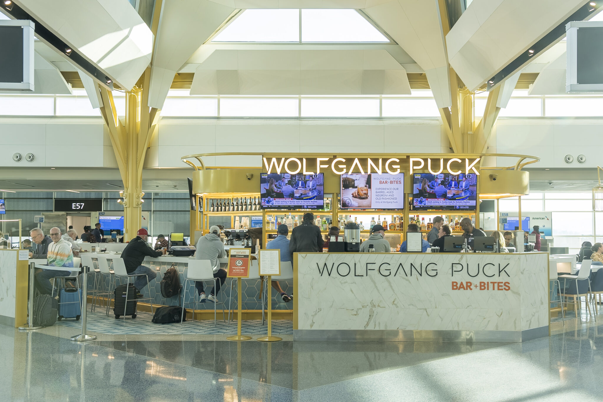 Not quite as luxurious as Wolfgang Puck’s Georgetown place, CUT, but the glossy gold-and-white bar feels like a little oasis at the center of the E Gate area. The eatery has accomplished an impressive feat: serving an actually good airport cheese plate.