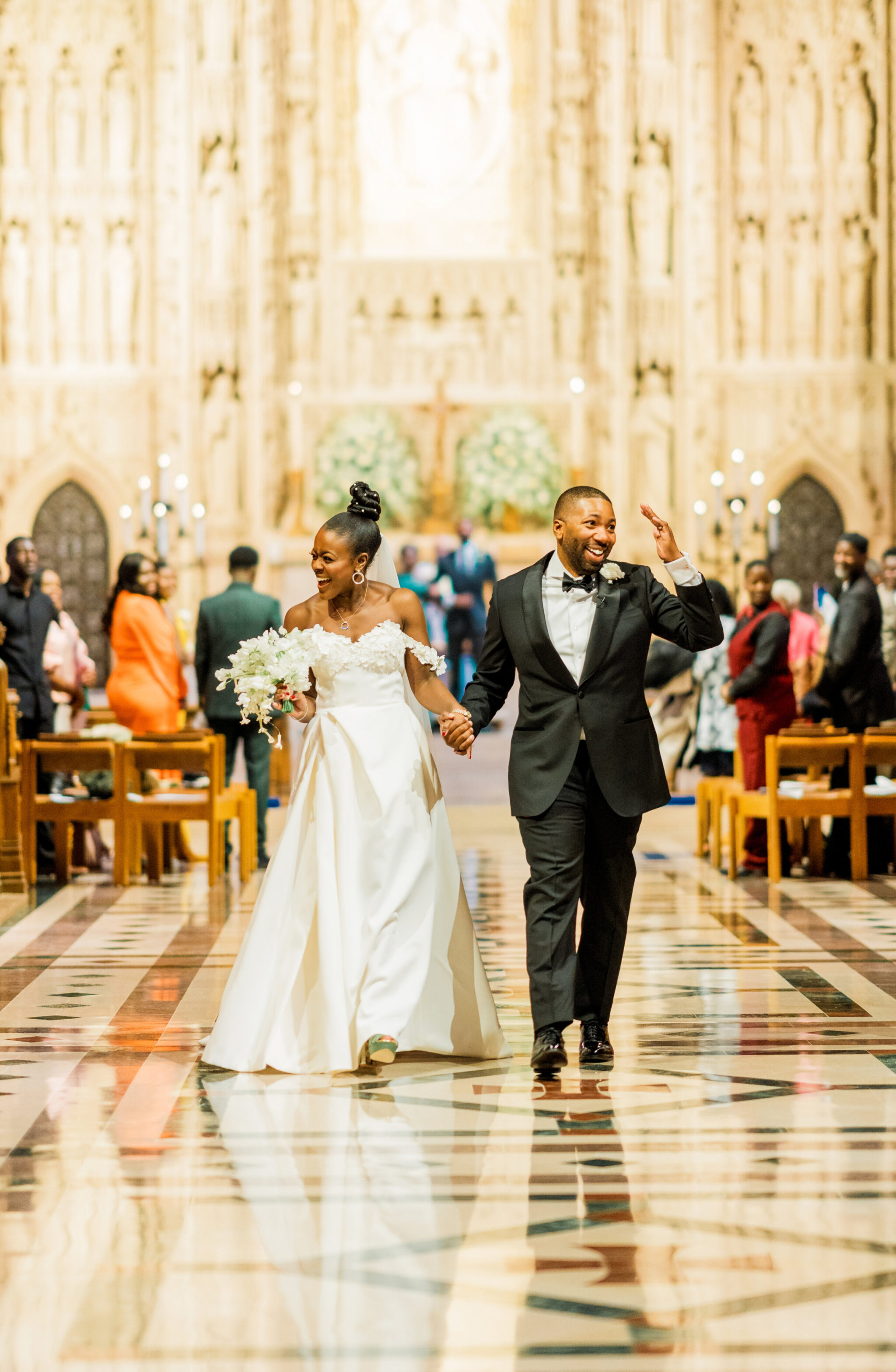The theme was a “Grecian Night Garden,” decorated in shades of green, yellow, and white. Juliana’s attire included a gown with floral appliqué for the ceremony, and for the reception, a custom kente—in honor of Juliana’s Ghanaian heritage (they had a wedding in Ghana, too)—and then a beaded dress. Alex opted for a black tux for the ceremony and a white dinner jacket for the reception.
