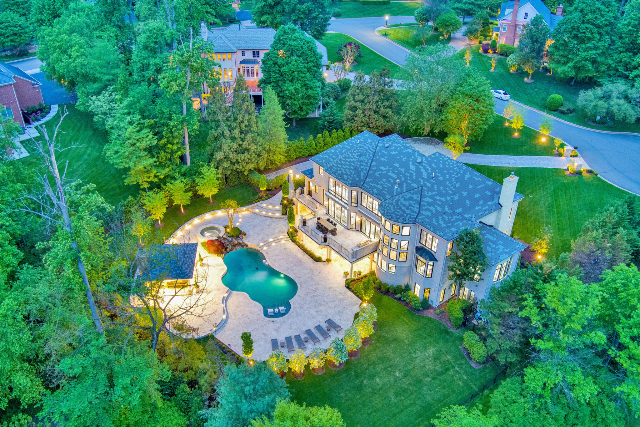 This 10,000-square-foot-plus estate features a fitness center, a spa with a Himalayan salt wall, a wine room, an elevator, and a swimming pool and patio area.