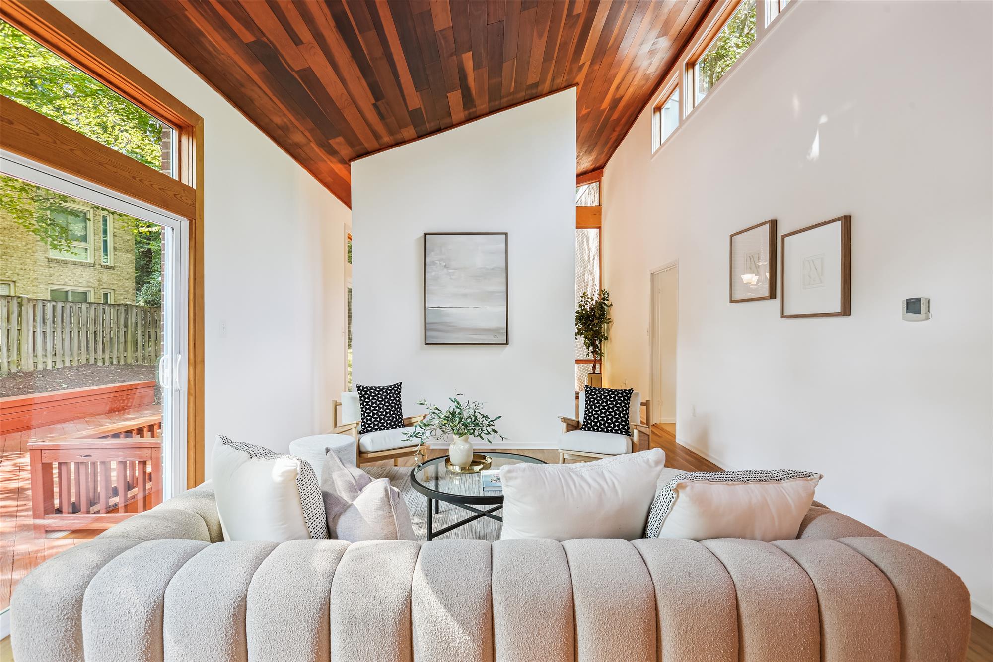 Located between Del Ray and Old Town, this listing offers a newly remodeled kitchen with a farmhouse sink and butcher-block countertops, a gas fireplace in the living room, and a backyard deck.
