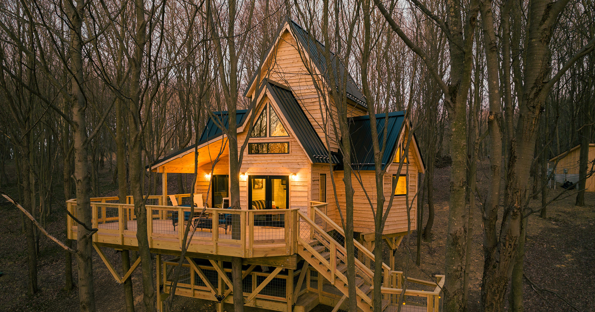 What’s more whimsical than a treehouse? A treehouse with a slide. Kids can ride down from tents on stilted platforms at this site three hours from Washington. The canvas walls and fire pits channel nostalgic camping, while wood floors and private bathrooms keep it in glamping territory.