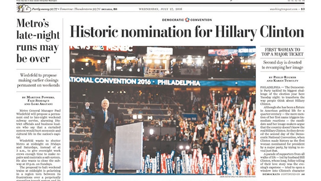 News & Politics Why Didn’t the Washington Post Put Hillary Clinton’s Photo on Its Front Page? Media, The Washington Post | Jul 27, 2016