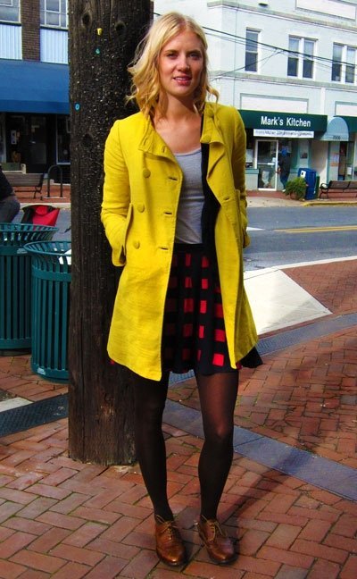 Shopping Sidewalk Style: Brogues and Checks Plus one sunny blonde reason to covet a yellow coat Shop Around, Sidewalk Style | Jan 11, 2011