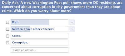 News & Politics The Daily Ask: What Worries You More, Crime or Corruption? Each day we ask our friends and followers to respond to a topic—here's what they had to say Capital Comment, The Daily Ask | Jun 21, 2011