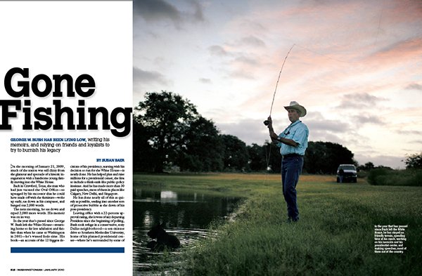 News & Politics Gone Fishing George W. Bush has been lying low, writing his memoirs, and relying on friends and loyalists to try to burnish his legacy. People | Jan 1, 2010