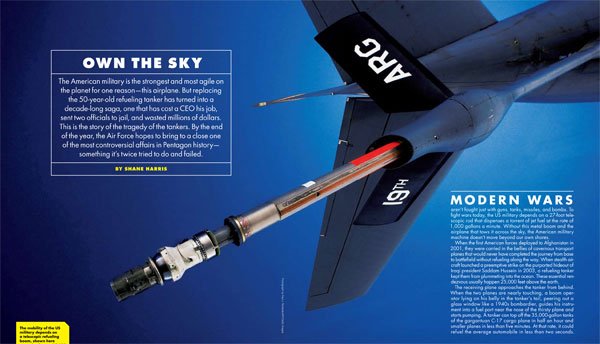 News & Politics Own the Sky The American military is the strongest and most agile on the planet for one reason - the refueling tanker. But replacing the 50-year-old airplane has turned into a decade-long saga, one that has cost a CEO his job, sent two officials to jail, and wasted m People | Nov 1, 2010