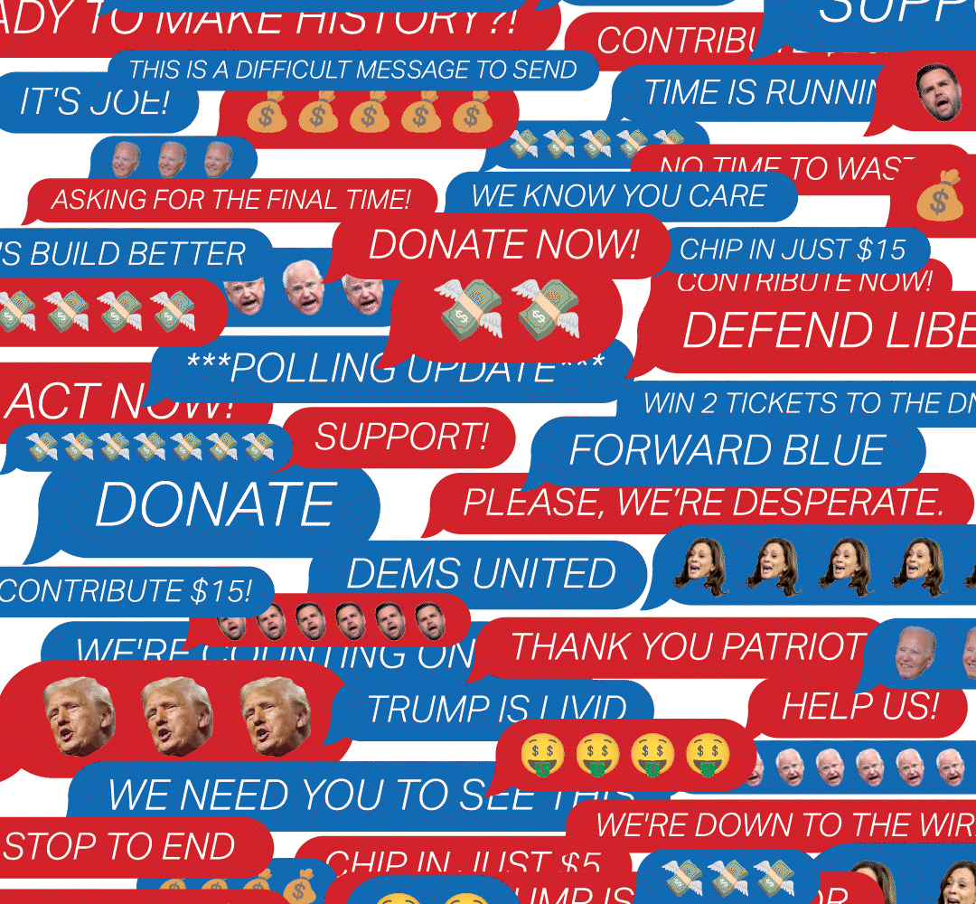 News & Politics Why Are Annoying Political Texts Out of Control? Often unwanted, increasingly unhinged, and almost always asking for money, political texts have become a campaign cash cow—turning America’s touchscreens into a perpetually pinging nightmare of inescapable irritation. 2024 presidential election, Presidential Campaign | Oct 24, 2024